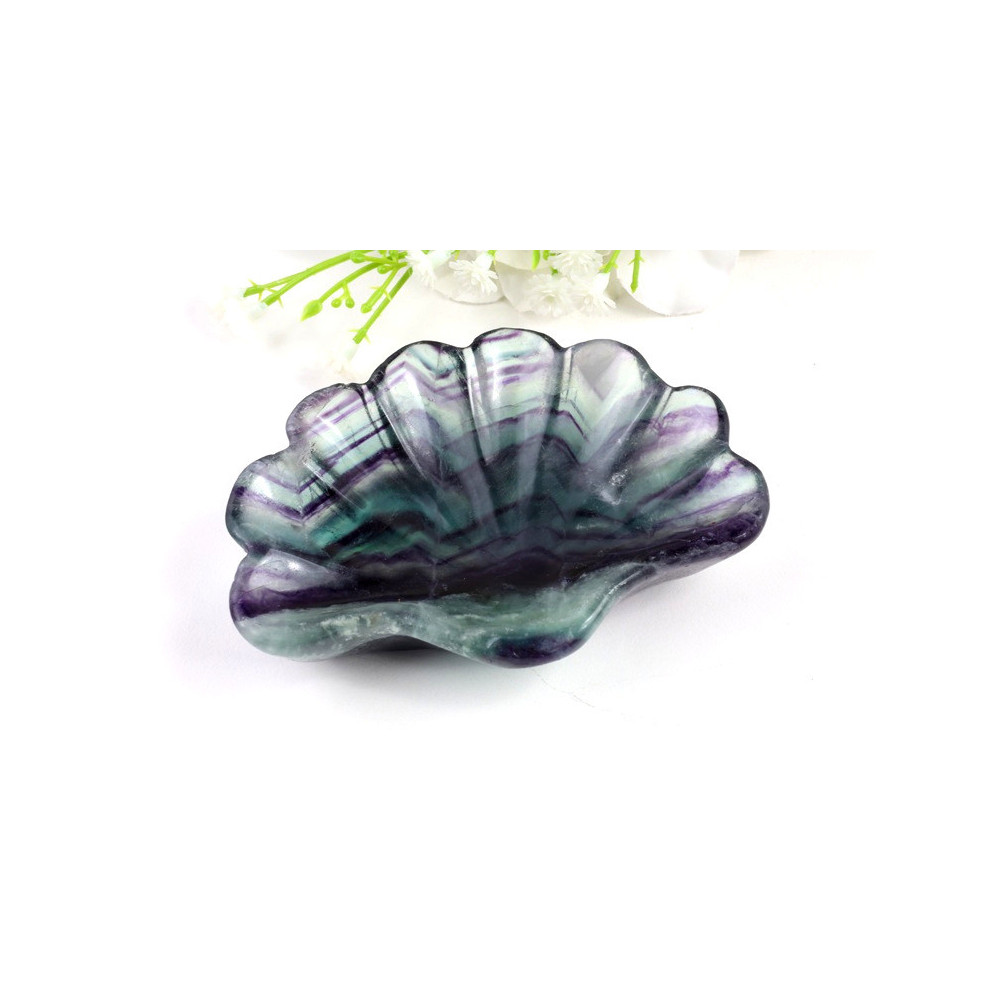 Tato nádherná dekorační mistička z duhového fluoritu zaujme svou harmonickou kombinací barev. Na první pohled upoutají zářivé tyrkysově-zelené pásy, které se jemně prolínají s hlubokými fialovými a purpurovými tóny. Ve středu misky se nachází oblast s intenzivními fialovými odstíny, které přecházejí do jemnějších růžových a čirých partií. Povrch kamene má příjemný lesk a částečnou průhlednost, která podtrhuje duhovou kresbu minerálu. Oválný tvar misky je pravidelný a praktický, díky čemuž je tento kus vhodný jak pro dekorativní účely, tak pro ukládání drobných předmětů.