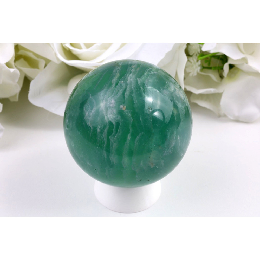 Tato leštěná koule zeleného fluoritu zaujme na první pohled svou výraznou páskovanou strukturou. Povrch zdobí střídavé pásy různých odstínů zelené – od tmavší lahvově zelené po světlejší smaragdové tóny. Vrstevnaté formace vytvářejí na povrchu jedinečnou kresbu, která je u každého kusu jiná. Koule je hladce vybroušená s vysokým leskem, který zdůrazňuje přirozené zbarvení minerálu. Kámen je částečně průsvitný, což umožňuje světlu pronikat do jeho struktury a vytvářet zajímavé hry světla a stínu. Rozměr 60 mm a hmotnost 356 g z ní činí impozantní dekorativní kus s příjemnou hmotností v ruce.