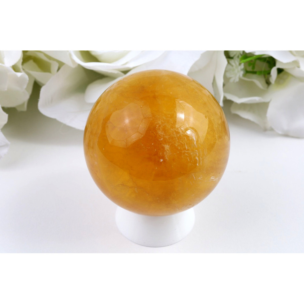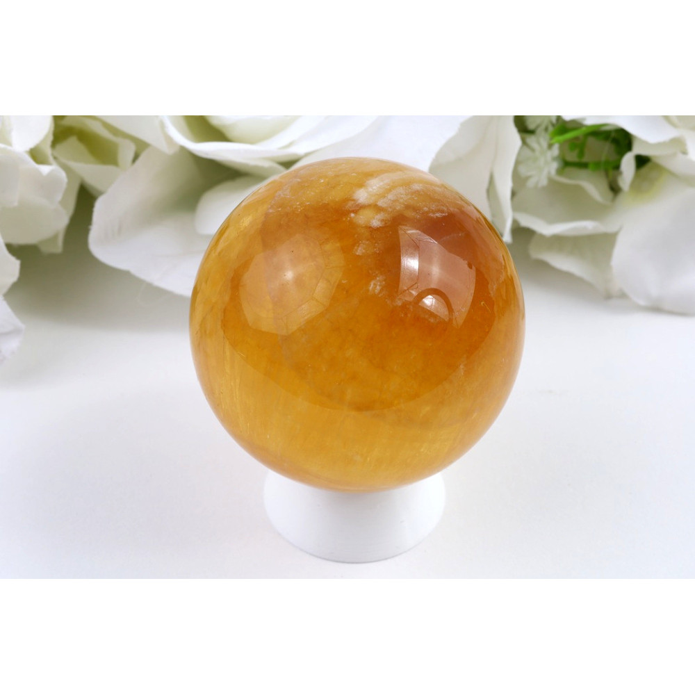 Tato jedinečná koule z žlutého fluoritu uchvátí svou teplou medově žlutou barvou s průhlednými až průsvitnými partiemi. Povrch kamene je dokonale vyleštěn do vysokého lesku, který zvýrazňuje typickou vrstvenou strukturu fluoritu. Na povrchu koule lze pozorovat zajímavou kresbu tvořenou jemnými pruhy a barevnými přechody, které vytvářejí světlejší i tmavší oblasti. Každý kus je originálem vytvořeným přírodou.