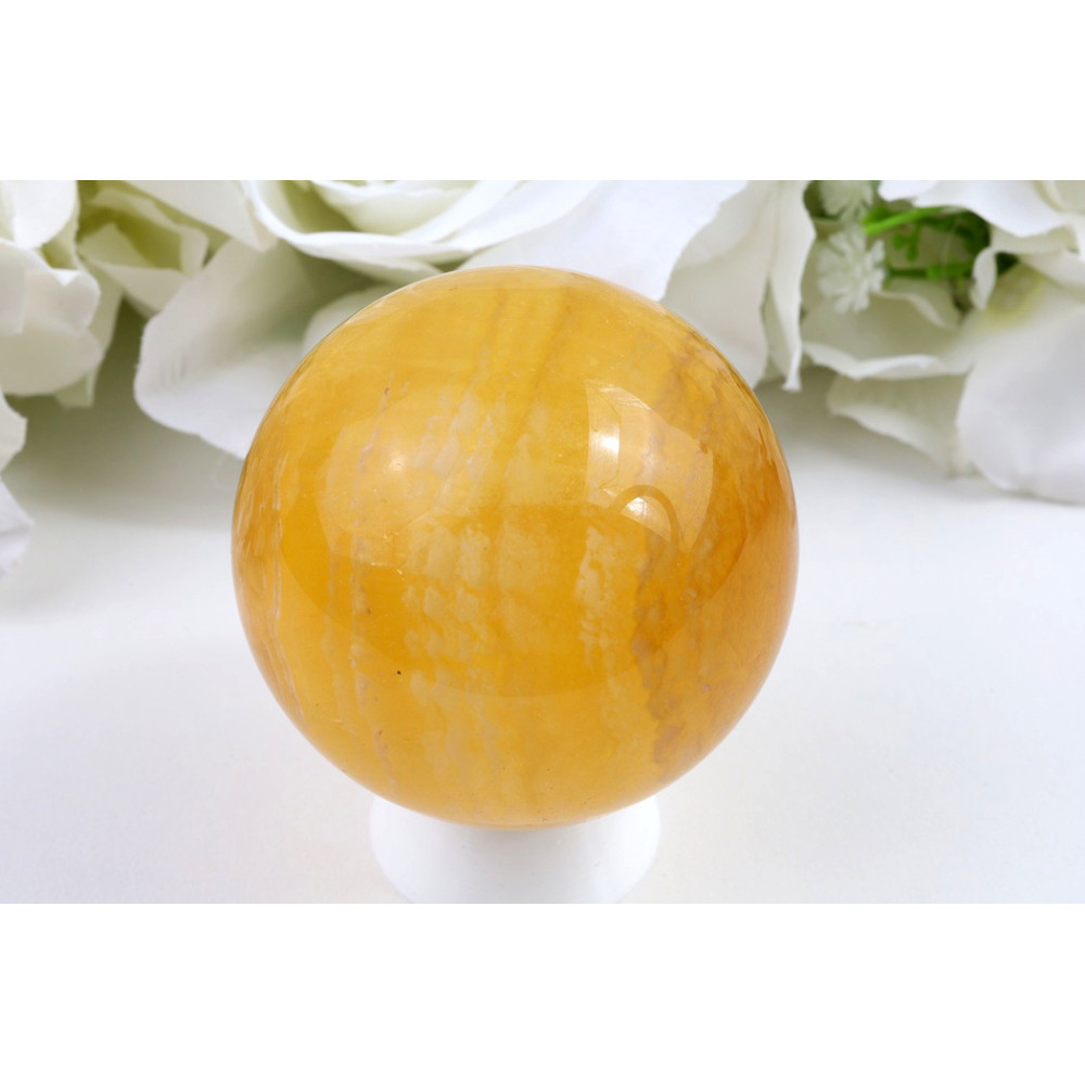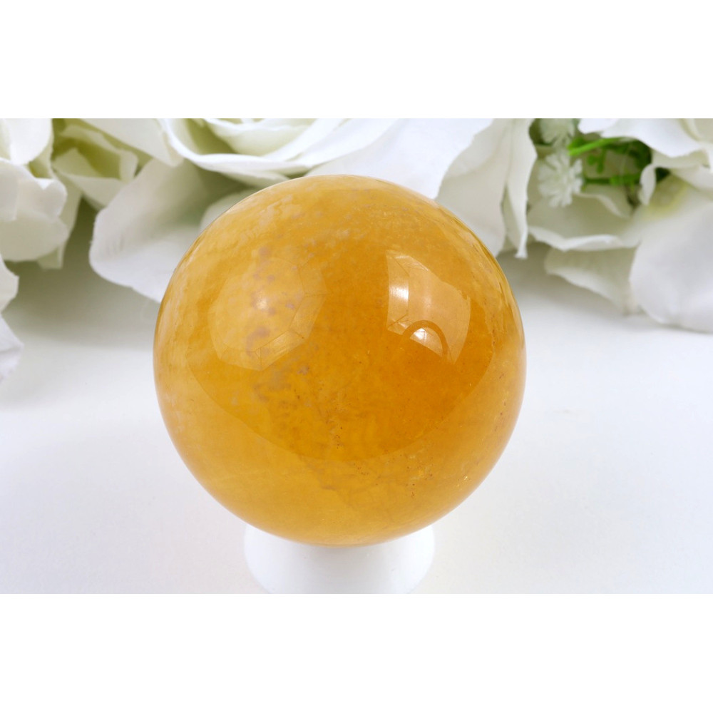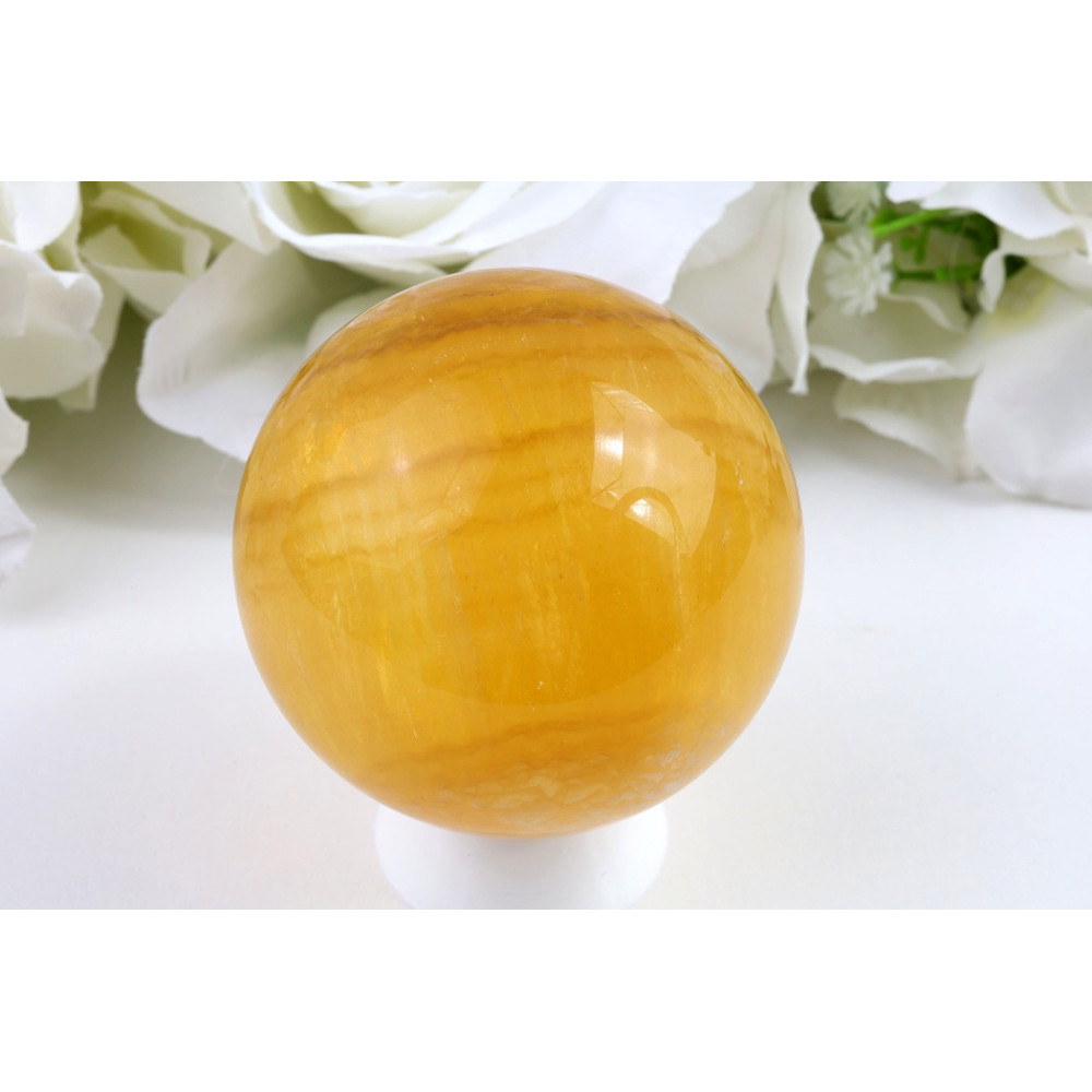 Tato koule z čínského žlutého fluoritu okouzlí svou medově zlatavou barvou s teplými odstíny, které vytvářejí harmonickou barevnou paletu. Povrch koule je dokonale vyleštěn do vysokého lesku, který zdůrazňuje průsvitnost kamene a jemné páskování. Zlatavé odlesky se mění v závislosti na osvětlení a vytvářejí tak živý a dynamický vzhled. Kresba připomíná medovou tekuturu s plynulými přechody, které dodávají kusu na eleganci a přirozenosti.