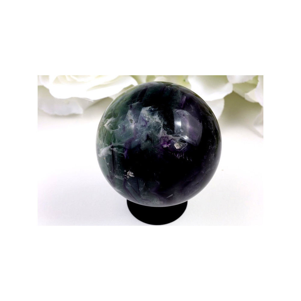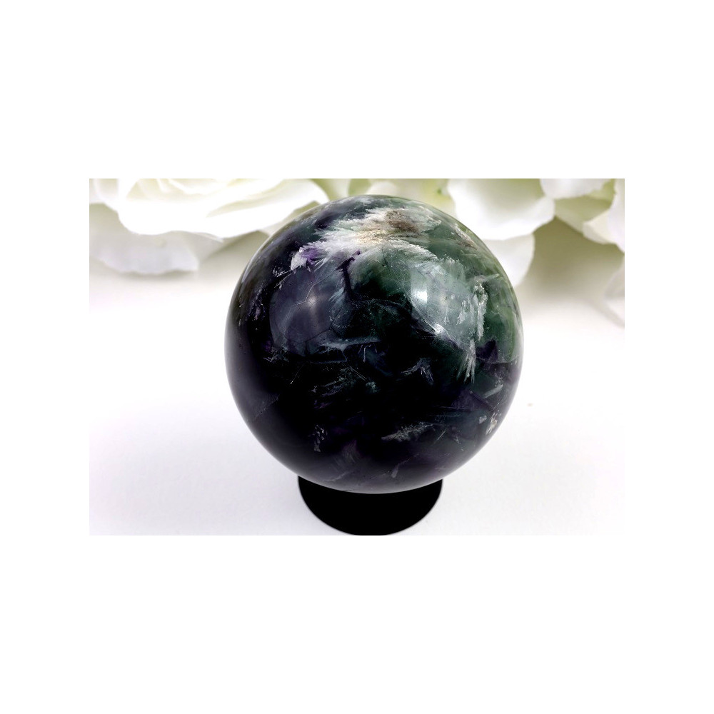 Leštěná koule z vločkového fluoritu o průměru 63 mm a hmotnosti 413 g vyniká výraznými barevnými pásky zelené, fialové a bílých vloček. Povrch má sklovitý lesk, poloprůsvitné části dodávají optickou hloubku i jiskru. Vzory připomínají ledové krystaly v přírodním minerálu – každý kus je originál s unikátní barevnou kombinací a strukturou.