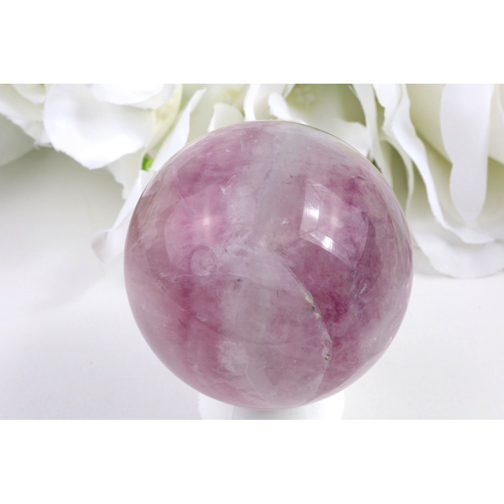 Tato nádherná koule fluoritu vás okouzlí svým jemným fialovo-růžovým zbarvením s měkkými barevnými přechody. Kámen vyniká svou průsvitností až průhledností, kde se střídají světlejší růžové oblasti s intenzivnějšími fialovými pruhy. Hladký, profesionálně leštěný povrch odráží světlo a vytváří jemný hedvábný lesk. Charakteristické jsou vrstevnaté struktury a oblačné mramorované vzory, které dávají každé kouli jedinečný charakter a kresbu.