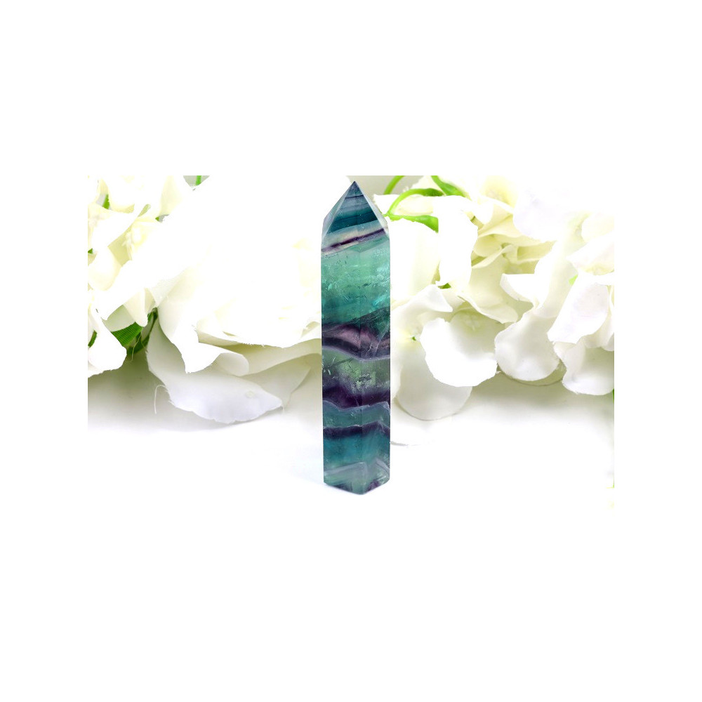 Tento nádherný fluoritový obelisk představuje mistrovské dílo přírody s elegantním tvarem čtyřbokého hranolu, který je zakončen špičatou pyramidkou. Kámen se vyznačuje úchvatným barevným proužkováním, kde se střídají odstíny tyrkysové, zelené, modré a fialové barvy v harmonických horizontálních pásech procházejících celým kamenem. Fluorit je hladce vybroušený s dokonale lesklým povrchem, který zvýrazňuje jeho průsvitné až poloprůsvitné partie. Každý barevný pruh je jedinečný a vytváří fascinující optickou hru světla a barev. Rozměry 108x24x20 mm zajišťují dokonalé proporce pro dekorativní i meditační účely.