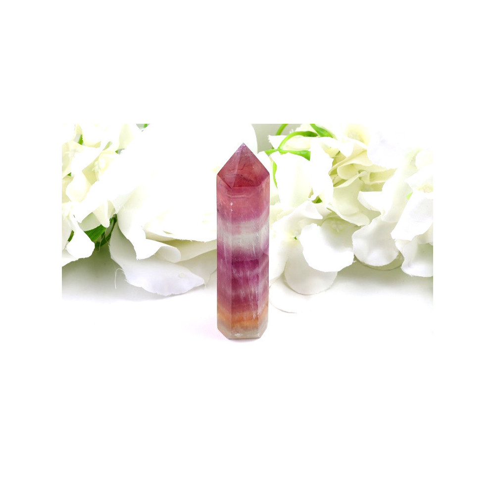 Tento nádherný duhový fluorit se prezentuje jako elegantní hexagonální krystalová věž s dokonale vypracovaným špičatým vrcholem. Kámen okouzluje fascinujícím barevným přechodem, který vytváří skutečnou duhu v minerálu. Horní část věže září v něžných růžovo-červených odstínech, které plynule přecházejí do jemných fialových a růžových tónů ve střední části krystalu. Základna kamene pak překvapuje teplými jantarově-medovými odstíny, které dodávají celému produktu jedinečný charakter. Povrch fluoritu je pečlivě vybroušen do lesklého, hladkého finishe, který zdůrazňuje jeho poloprůhlednost a poloprůsvitnost. Díky této vlastnosti jsou krásně viditelné vnitřní vrstvy a pásy, které vytvářejí fascinující optický efekt. Kámen je zpracován s maximální péčí, aby vynikla jeho přirozená krása a barevná harmonie.