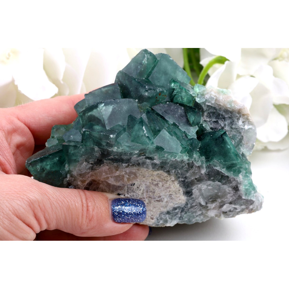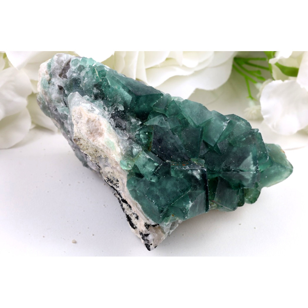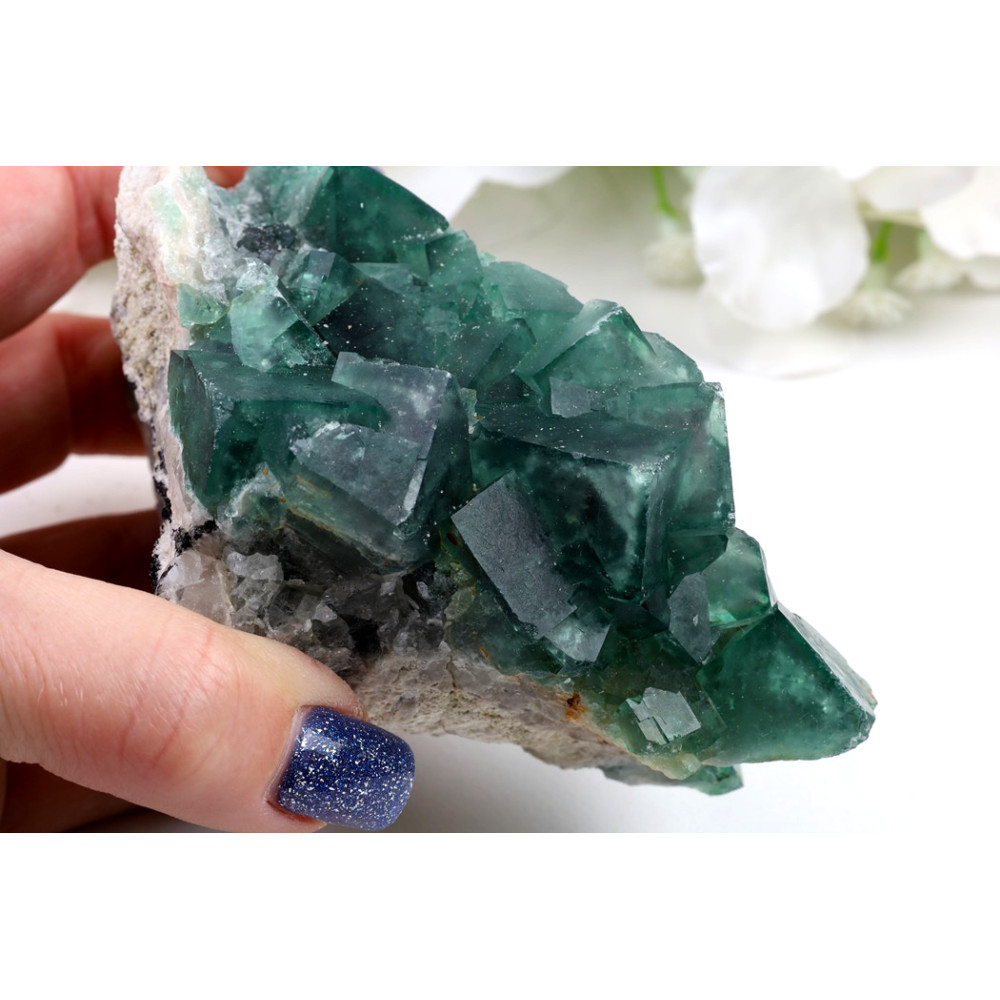 Tento unikátní kus zeleného fluoritu č. 1231 vás okouzlí svou přirozenou krásou. Jedná se o působivý shluk krystalů fluoritu, které se pyšní rozmanitými odstíny sytě zelené barvy, přecházející od průsvitné až po mírně zakalenou, s krásnými kubickými formacemi. Jednotlivé krystaly se lesknou a odrážejí světlo, zvýrazňujíce tak svou krystalickou strukturu. Jsou usazeny v přírodní matrici světlejší, šedobílé horniny, která tvoří zajímavý kontrast a podtrhuje autenticitu tohoto přírodního minerálu. Jedná se o ručně vybraný originální kus s bohatou texturou a fascinující kresbou.