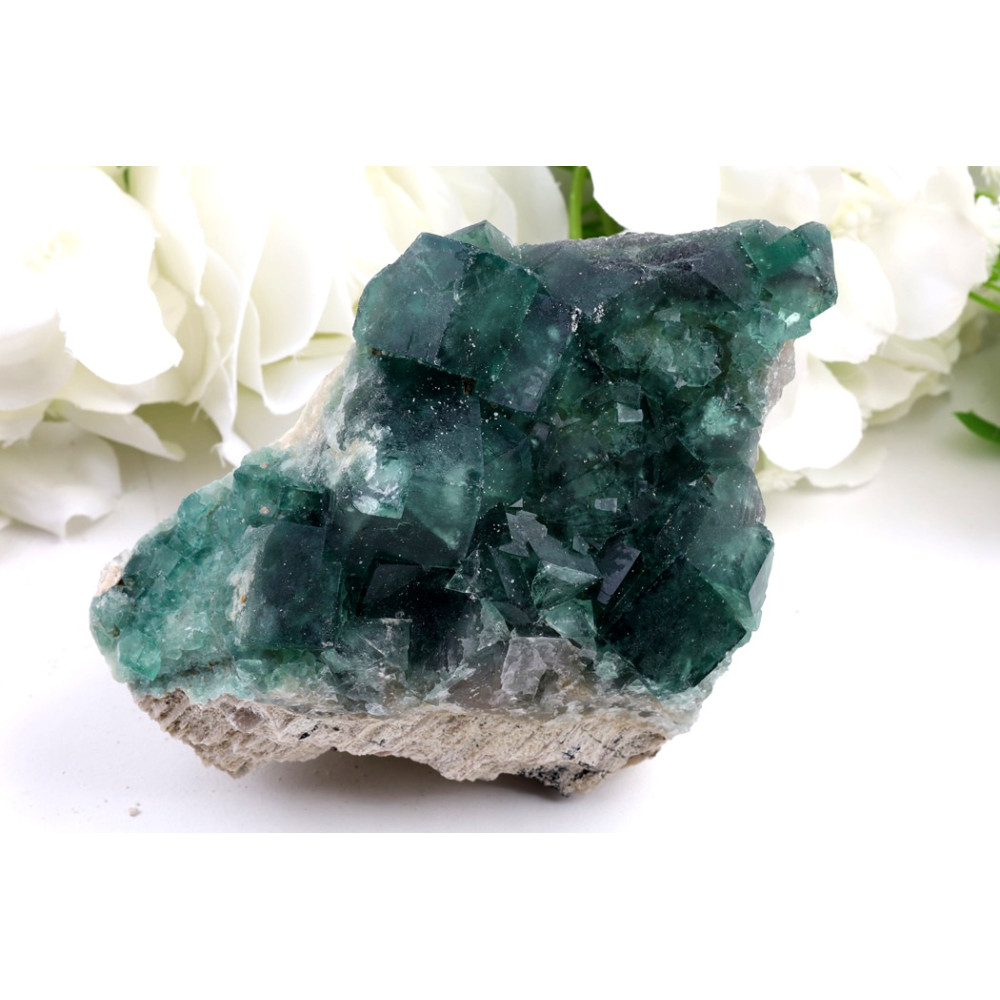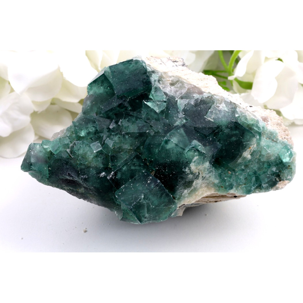 Tento originální kus zeleného fluoritu č. 1232 z Madagaskaru je fascinující ukázkou přírodní krásy. Skládá se z mnoha drobných i větších krystalů s kubickou strukturou, které jsou vrostlé do světlejší matrix. Barva krystalů přechází od sytě tmavě zelené až po průsvitnější, světlejší tyrkysové a smaragdové odstíny, které propouštějí světlo a odhalují vnitřní strukturu. Místy je patrný bělavý až krémový mateční kámen a zajímavé vrstvení minerálů, které dodávají kameni rustikální, ale zároveň elegantní vzhled. Jedná se o skutečně jedinečný přírodní minerál, ručně vybraný pro naši kolekci.