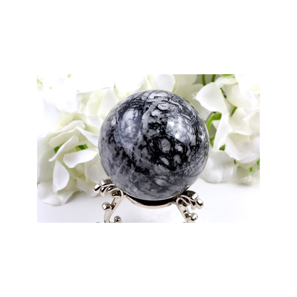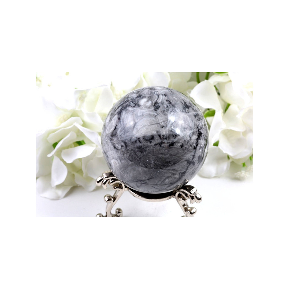 Tato nádherná koule ze skořápkového kamene okouzlí svou jedinečnou barevnou kombinací a přírodními fosílními vzory. Povrch koule je dokonale vyleštěn do vysokého lesku, což umocňuje hloubku barev a zvýrazňuje kontrasty mezi tmavě šedými až černými partiemi a světlými bílo-béžovými fosíliemi dávných mořských organismů. Průměr koule dosahuje 67 mm, což z ní činí ideální dekorativní prvek i meditační pomůcku.