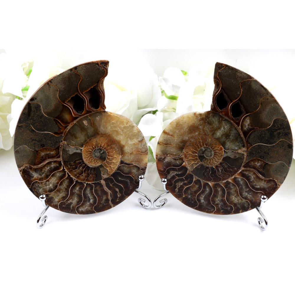 Tento konkrétní amonit, kus č.1490, se prezentuje jako nádherně rozdělený exemplář s dokonale leštěnými polovinami, které odhalují jeho vnitřní krásu. Vidíme zde bohatou paletu hnědých a krémových odstínů, které se harmonicky prolínají a vytvářejí tak složitou kresbu. Vnější okraje jsou tmavě hnědé, postupně přecházející do světlejších, zlatavých tónů směrem k centru spirály. Na řezu jsou patrné elegantní septa, tedy přepážky, které kdysi dělily komory měkkýše, a které nyní tvoří fascinující, vlnící se linie v hnědavých a mléčně bílých barvách. Centrální spirála je precizně zachovaná a zdůrazňuje dokonalou geometrii přírody.