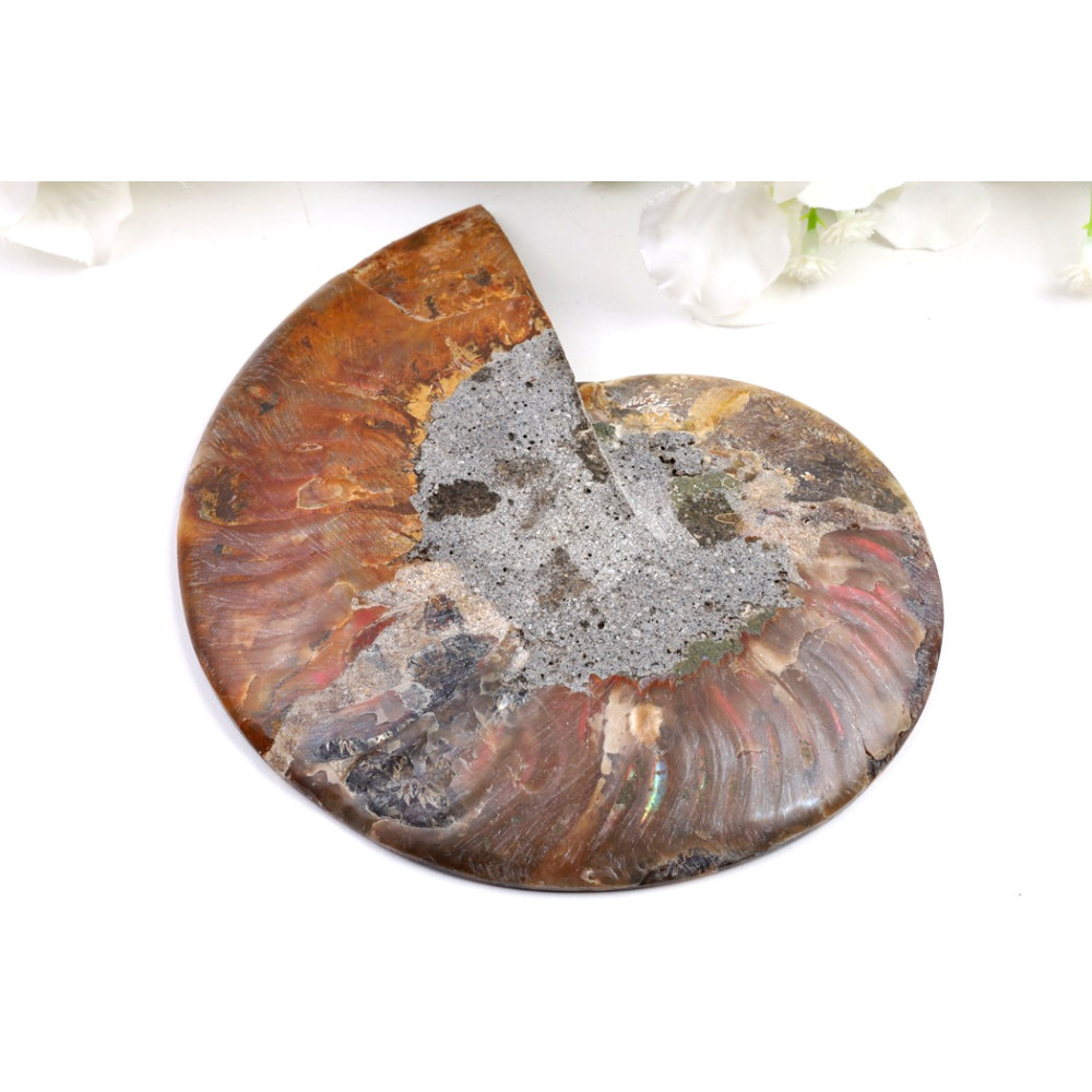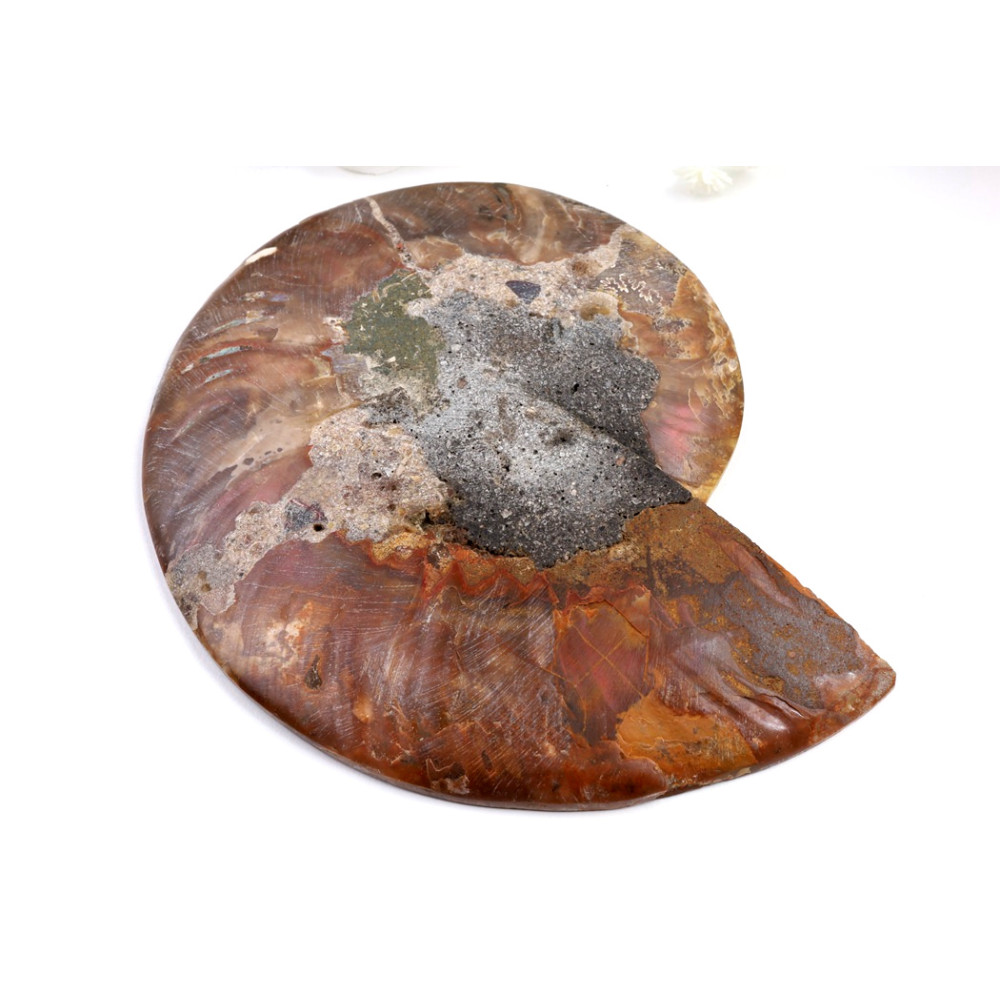 Mineralogicky je amonit zkamenělina hlavonožce ze skupiny amonitů, který obýval prehistorické oceány před miliony let. Jeho schránka, původně tvořená aragonitem, byla v průběhu geologických procesů postupně nahrazena jinými minerály, nejčastěji kalcitem, případně pyritem nebo chalcedonem. Leštěné řezy, jako je tento, odhalují vnitřní strukturu komor a přepážek, které jsou dnes vyplněny druhotnými minerály. Tyto vnitřní struktury nám poskytují jedinečný vhled do anatomie dávných živočichů.