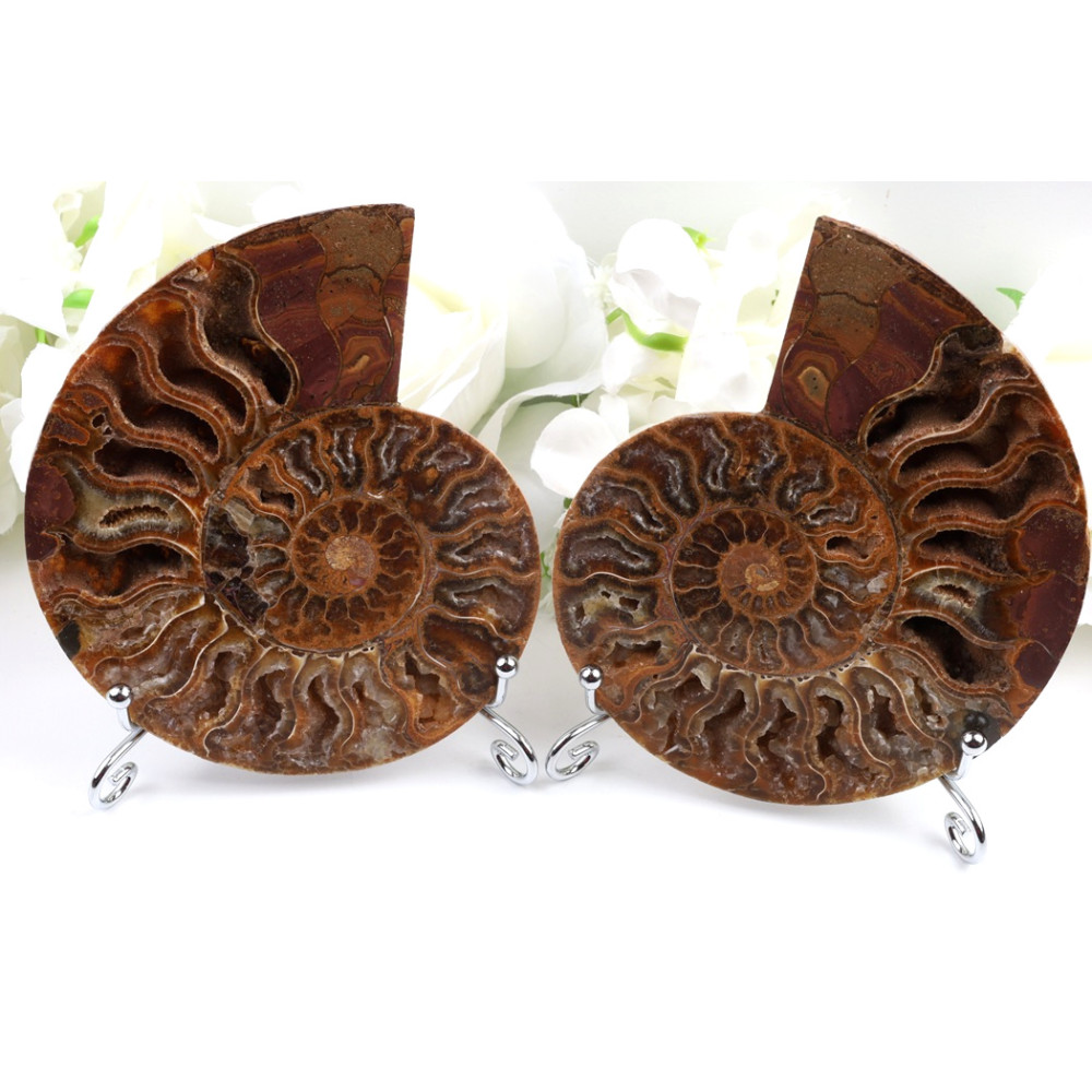 Z geologického hlediska jsou amonity zkamenělými schránkami vyhynulých mořských hlavonožců, které obývaly oceány před desítkami až stovkami milionů let. Tyto fascinující fosílie jsou tvořeny minerály, jako je aragonit, kalcit nebo pyrit, které postupem času vyplnily prázdné schránky a zachovaly jejich detailní strukturu. Barvy, jako je hnědá a okrová, vznikly díky minerálním složkám v okolní hornině během procesu fosilizace.