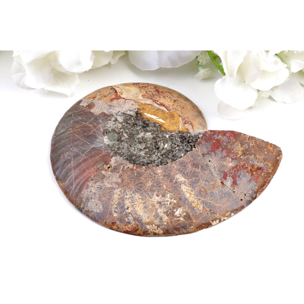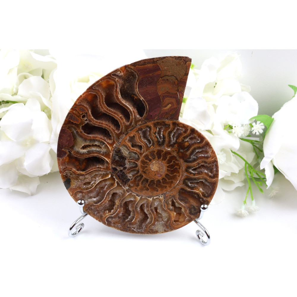 Tento amonit je výjimečným dekorativním prvkem, který se stane středobodem každého interiéru. Jeho prehistorická krása a unikátní struktura vyniknou na polici, pracovním stole nebo v obývacím pokoji, kde bude neustále přitahovat pozornost a podněcovat konverzaci. Je to ideální originální kus pro sběratele minerálů a fosilií, kteří ocení jeho historickou a estetickou hodnotu.
