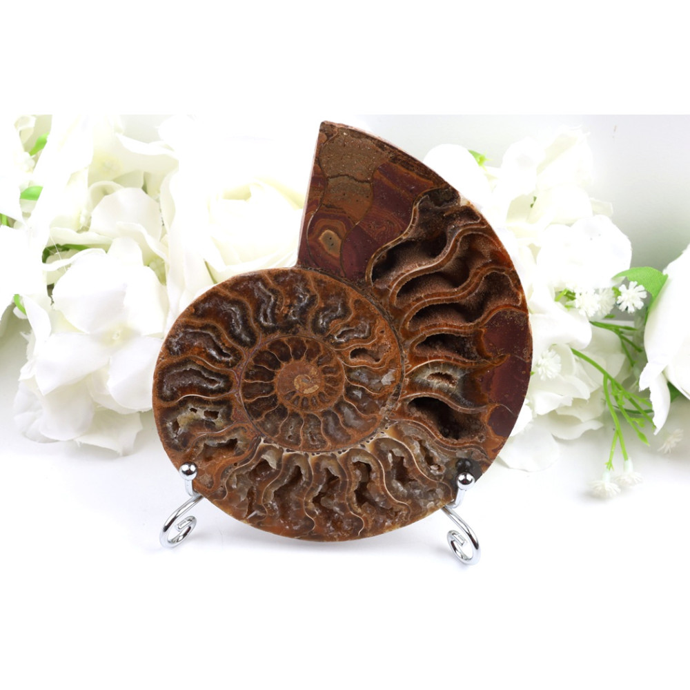 Tento nádherný amonit podnikl cestu z exotického ostrova Madagaskar, kde byl před miliony let pohřben v usazeninách dávného moře. Díky pomalému procesu mineralizace, kdy organické látky byly nahrazeny minerály, se jeho křehká schránka proměnila v odolnou fosílii, která přečkala miliony let geologických změn. Dnes k nám přichází jako posel z jiné doby, pečlivě vybrán a zpracován tak, aby jeho prastará krása mohla zdobit váš domov a vyprávět svůj nekonečný příběh.