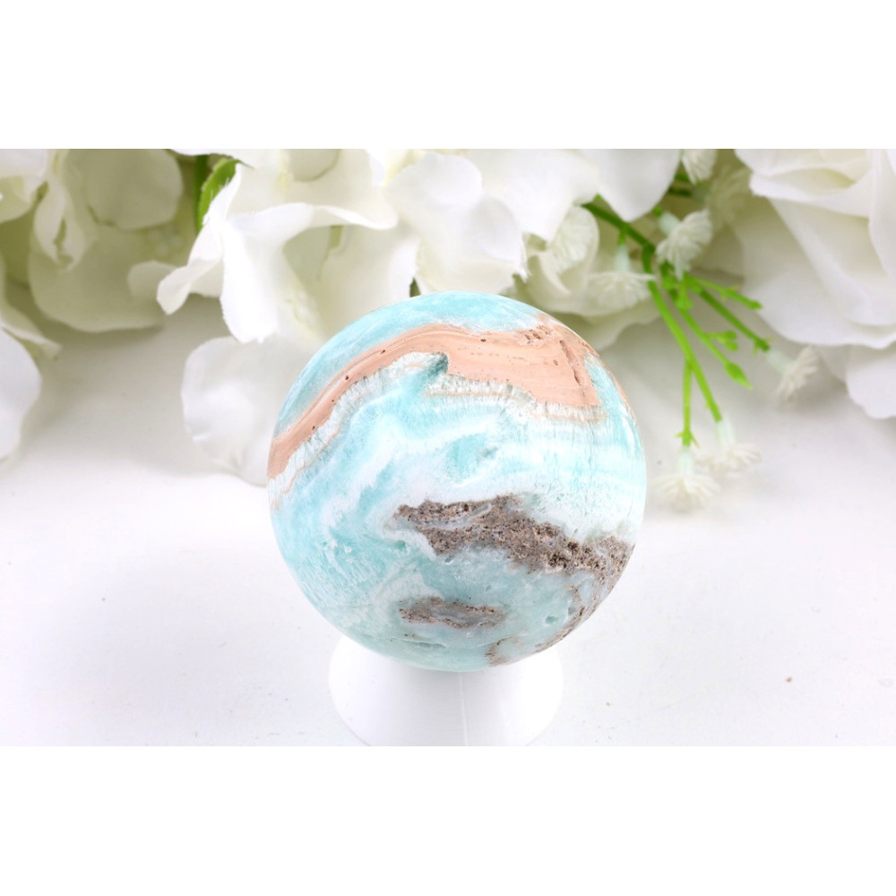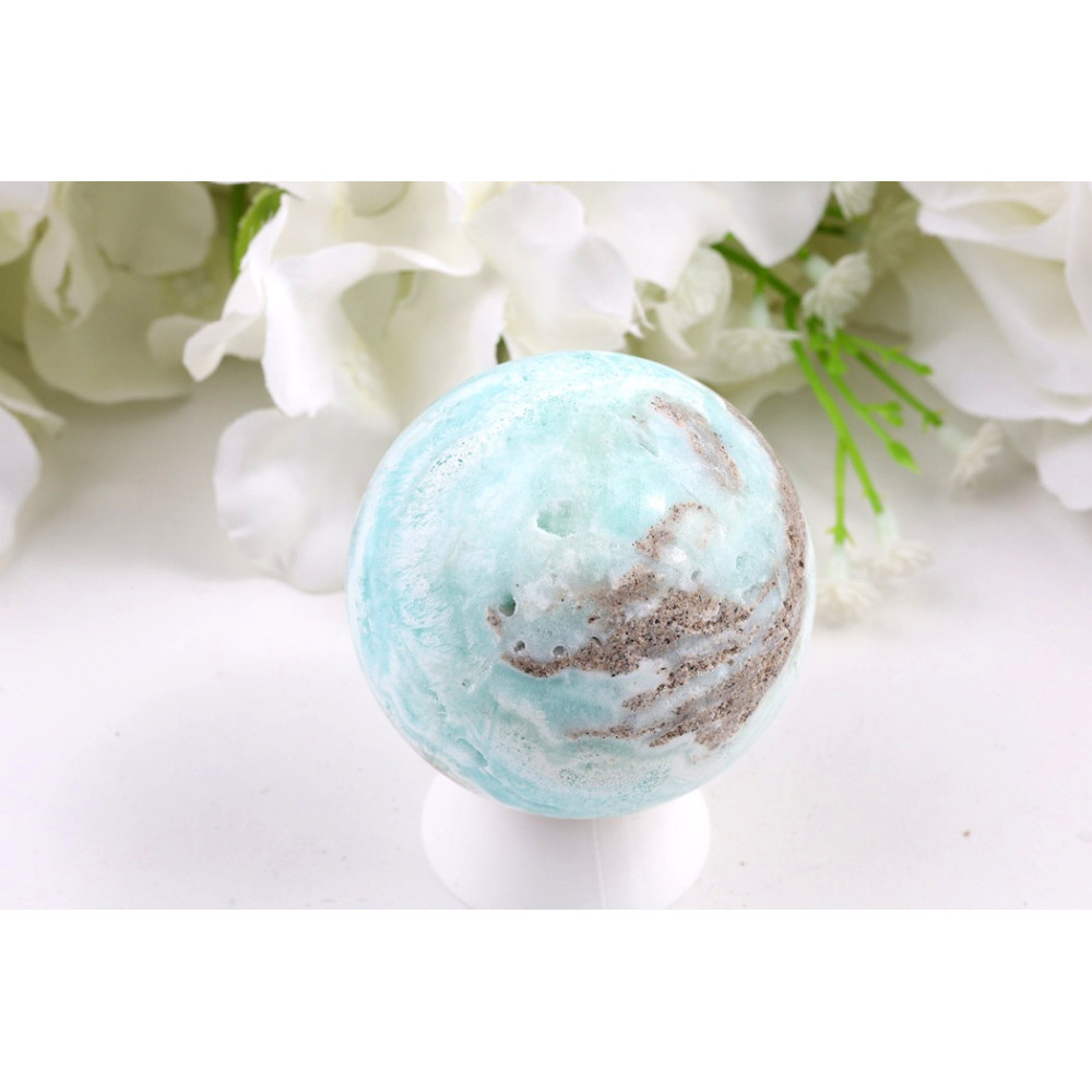 Tato koule hemimorfitu okouzlí svou jemnou tyrkysově zelenou barvou s měkkými přechody do světlejších odstínů. Povrch vyniká charakteristickou botryoidální strukturou připomínající drobné bublinky, která vytváří jedinečnou kresbu. Kámen je částečně průsvitný s jemným hedvábným leskem, který při různých úhlech pohledu krásně odráží světlo. Celková textura je hladká s přirozenými nepravidelnostmi, které podtrhují autentičnost tohoto přírodního kusu.