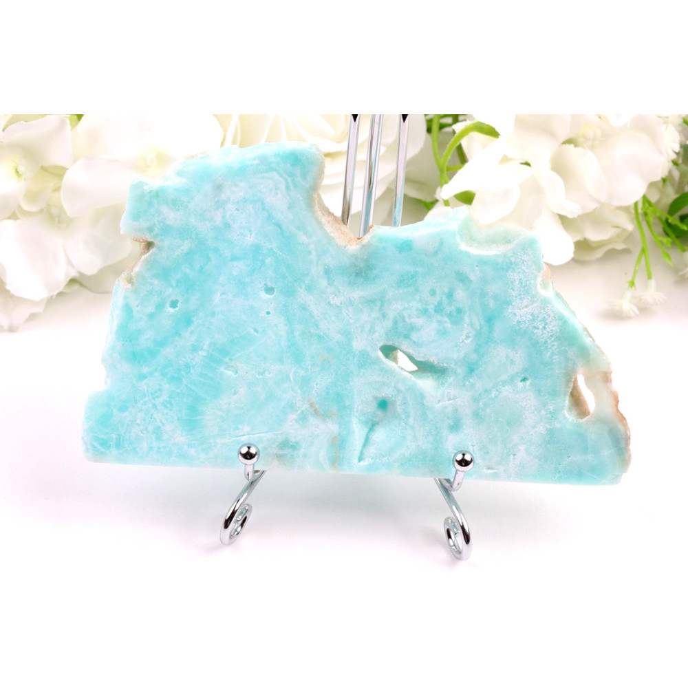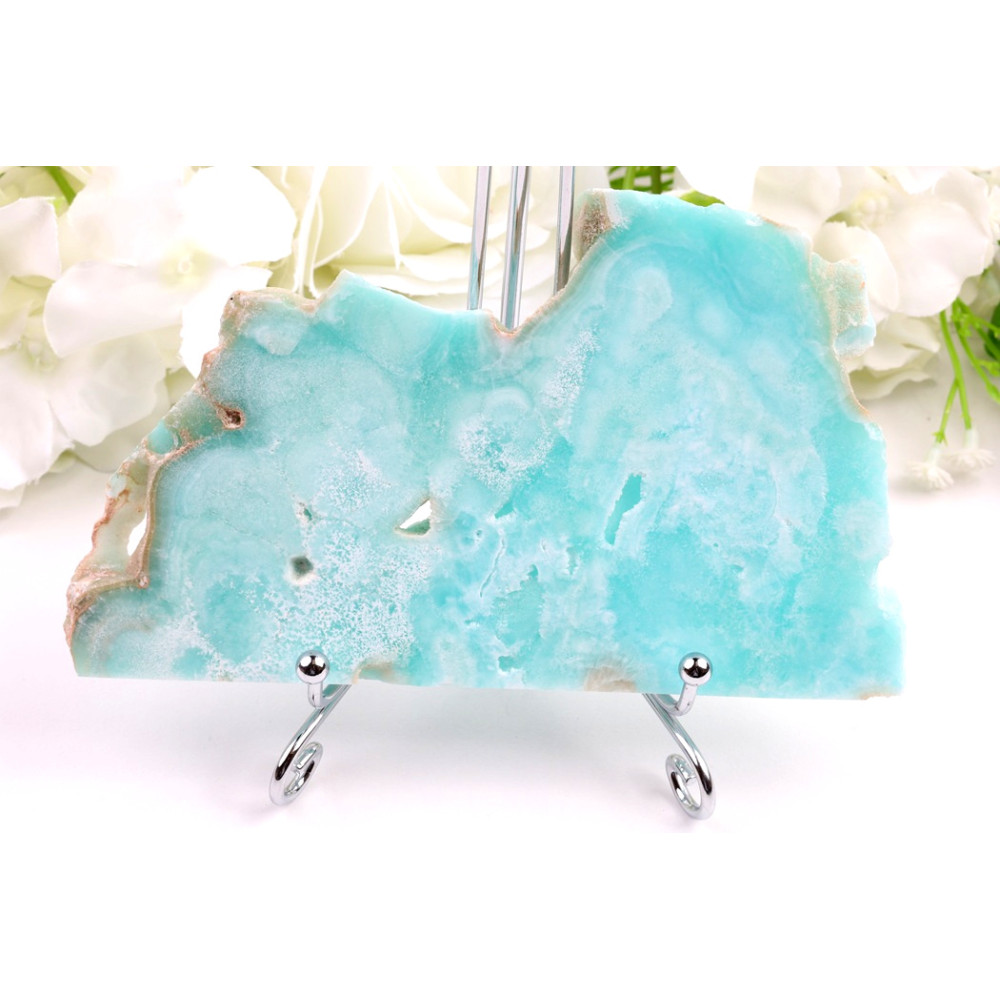 Tento konkrétní plátek hemimorfitu č. 1277 představuje úchvatnou paletu jemných tyrkysových a světle modrých odstínů, které plynule přecházejí do bělavých krystalických útvarů, vytvářejících na povrchu fascinující kresbu připomínající obláčky nebo mořskou pěnu. Některé okraje minerálu si zachovaly přírodní, drsnější texturu v béžových a světle hnědých tónech, což dodává kameni autentický, zemitý charakter. Na povrchu jsou patrné drobné přírodní dutinky a jemné inkluze, které zdůrazňují jeho jedinečný, přírodní původ. Leštěný povrch plátku krásně odráží světlo a podtrhuje jeho subtilní krásu.