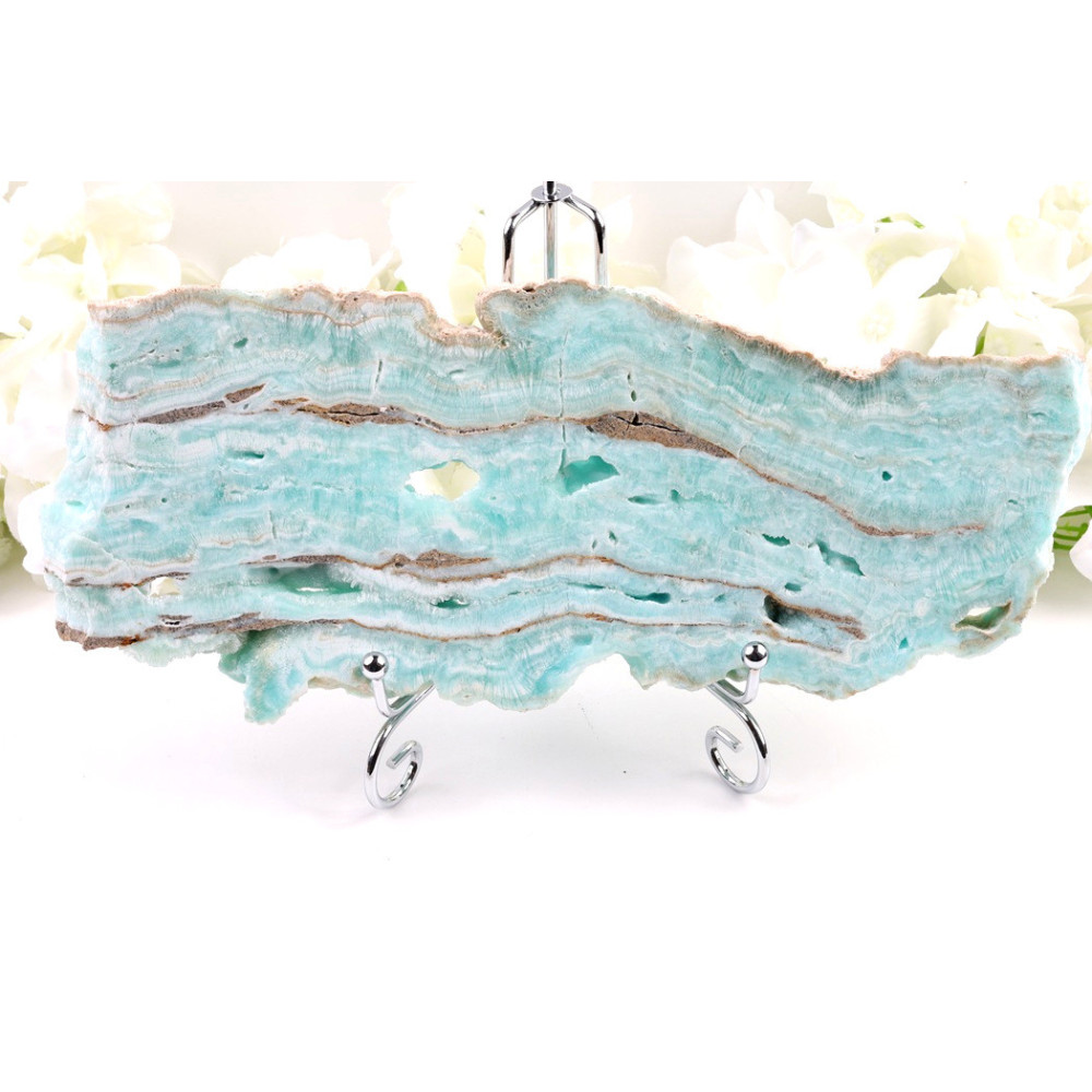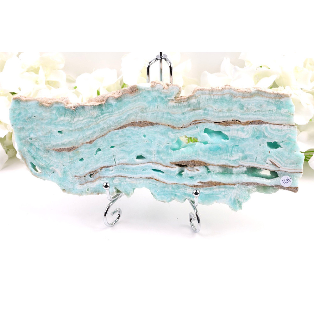 Tento výjimečný plátek hemimorfitu okouzluje svým nádhernými odstíny modré a zelené barvy, které se prolínají v jemné krystalické struktuře. Povrch kamene vyniká přirozenými odlesky a průsvitnými oblastmi, které vytvářejí unikátní hru světla. Krystalická kresba dává plátku jedinečný charakter a přirozený vzhled, typický pro kvalitní hemimorfity z brazilských lokalit. Kámen je plochého tvaru, ideální pro dekorativní účely i osobní sbírky.