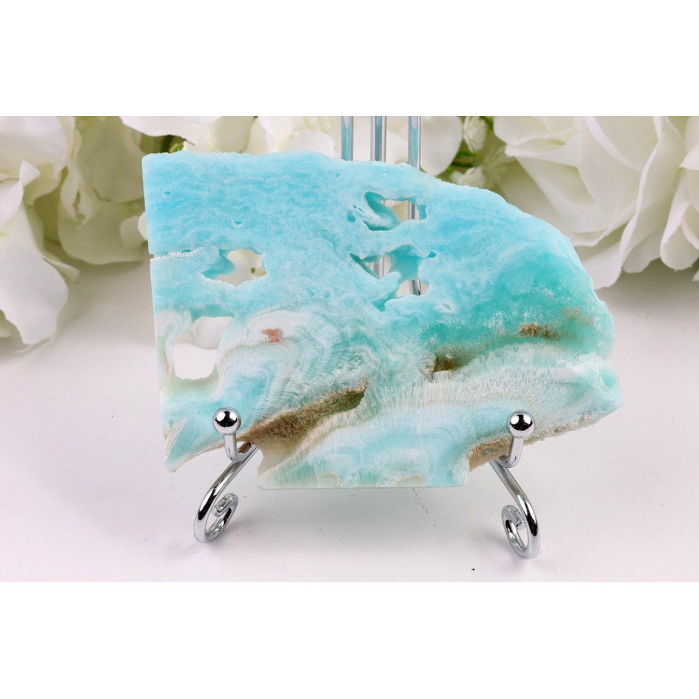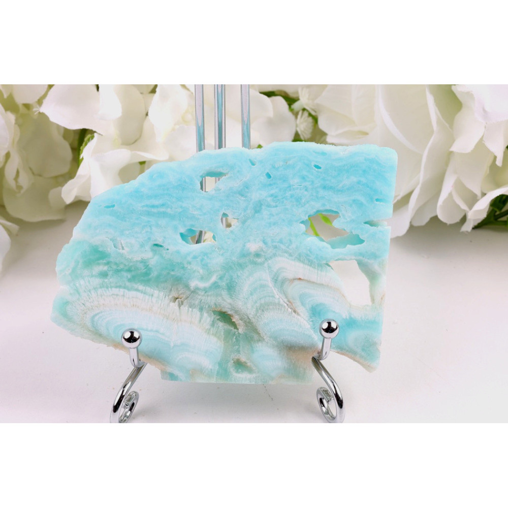Tento kompaktní plátek hemimorfitu zaujme svou jemnou tyrkysově modrou barvou s nádhernými přechody do nebesky modrých odstínů. Povrch kamene je pokryt jemnou krystalickou texturou s matným až hedvábným leskem. Přirozenou kresbu doplňují béžové a hnědavé žilky a inkluze, které procházejí celým kamenem a vytvářejí jedinečný organický vzor. Zvlněný povrch s drobnými krystalickými plochami dodává tomuto kusu autentický charakter přírodního minerálu z brazilských nalezišť.