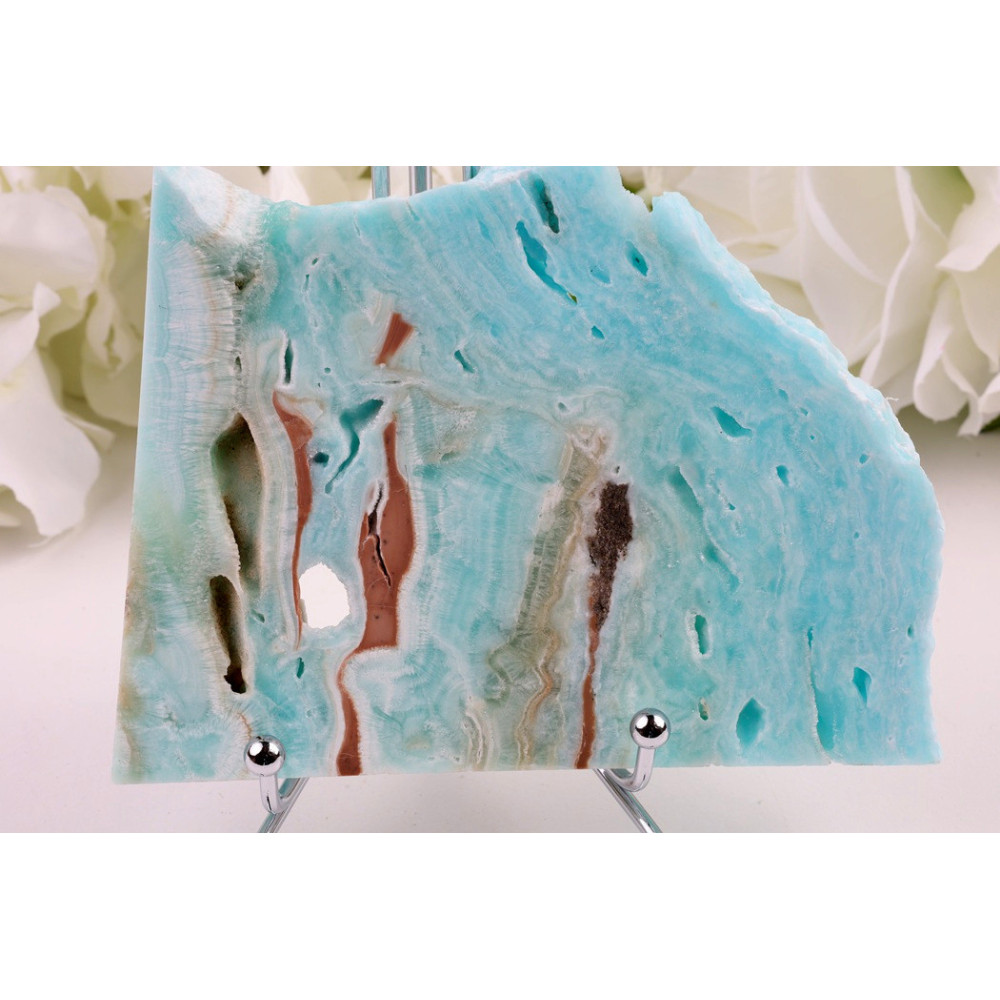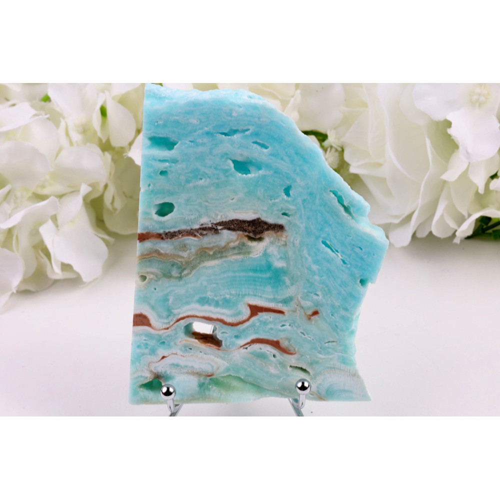 Tento jedinečný plátek hemimorfitu zaujme na první pohled svou nádhernou kombinací barev. Na povrchu kamene se střídají intenzivní modro-tyrkysové plochy s jemným skelným leskem a teplé pískovobéžové partie, které vytvářejí harmonický kontrast. Krystalická struktura hemimorfitu se projevuje drobnými lesklými ploškami, které při pohybu světla jemně odráží paprsky. Plátek má příjemně hladký povrch s přirozenými nerovnostmi, které podtrhují jeho autenticitu. Celkový vzhled je elegantní a uklidňující, s predominancí chladných modrých tónů proložených zemitými odstíny.