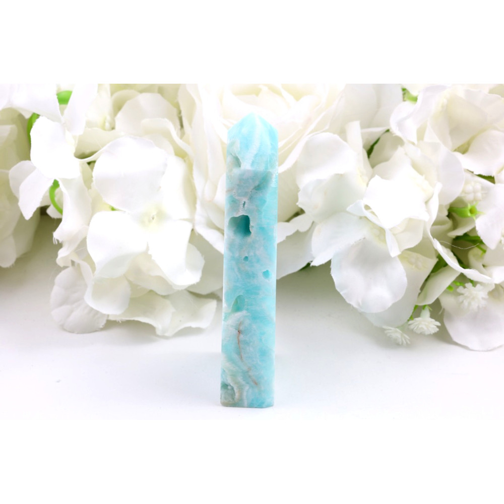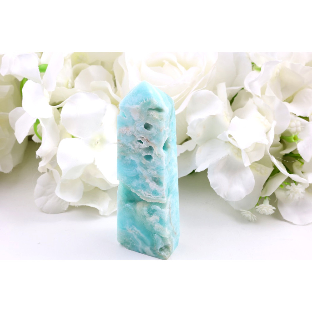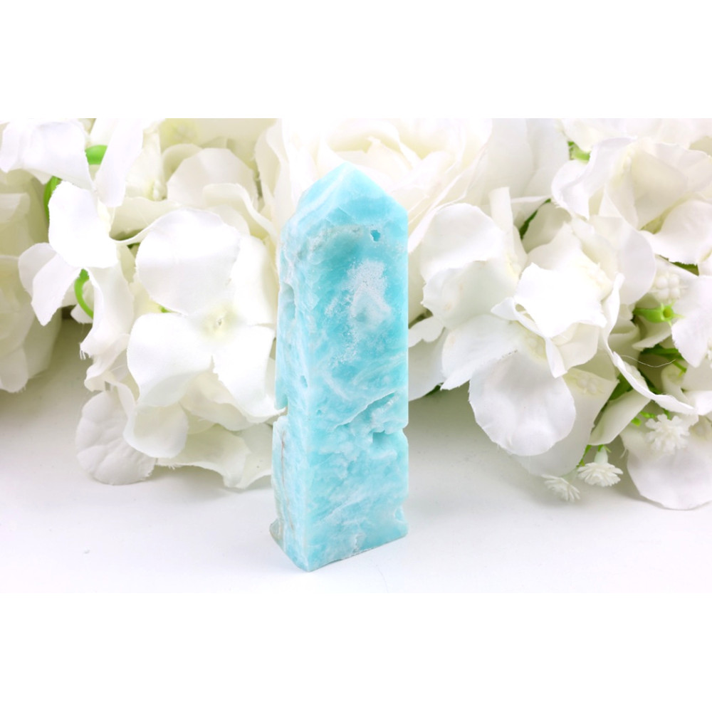 Tato fascinující věž z hemimorfitu č.1423 je mistrovským dílem přírody, které okamžitě upoutá pozornost svými něžnými modrobílými odstíny. Kámen se pyšní převážně světle tyrkysově modrou barvou, která se prolíná s jemnými bílými vrstvami a vytváří tak dojem lehkých obláčků na letní obloze. Na jedné straně vynikají přirozené dutinky, které dodávají věži autentický a syrový charakter, zatímco na jiných místech je povrch hladce leštěný, což podtrhuje krásu a hloubku barvy minerálu.