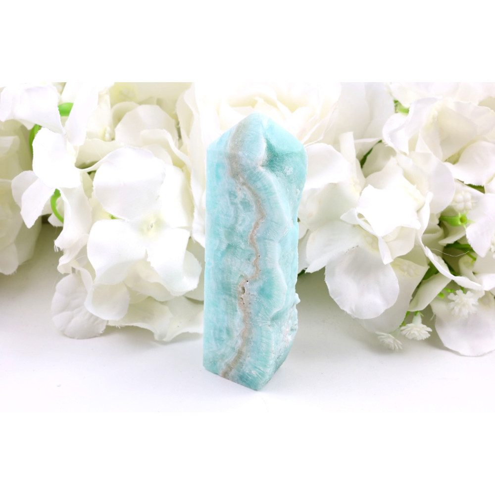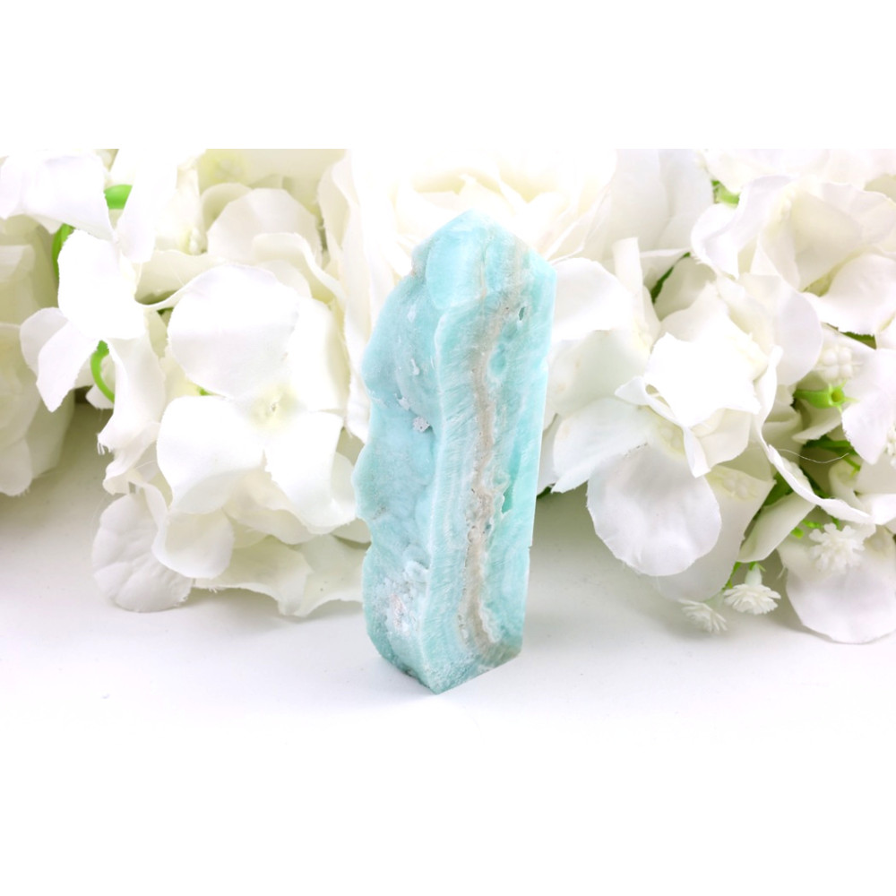 Představujeme vám úchvatnou věž z hemimorfitu, která se pyšní jemným tyrkysově modrým odstínem, připomínajícím klidnou mořskou hladinu. Povrch kamene je elegantně leštěný, avšak zachovává si na jedné straně svou přírodní strukturu s drobnými krystalickými shluky a inkluzemi, které propůjčují tomuto kusu autentický a neopakovatelný charakter. Napříč minerálem se táhnou subtilní bílé a krémové vlnky, které vytvářejí dojem plynulosti a hloubky, zatímco lesk je převážně matný až saténový.