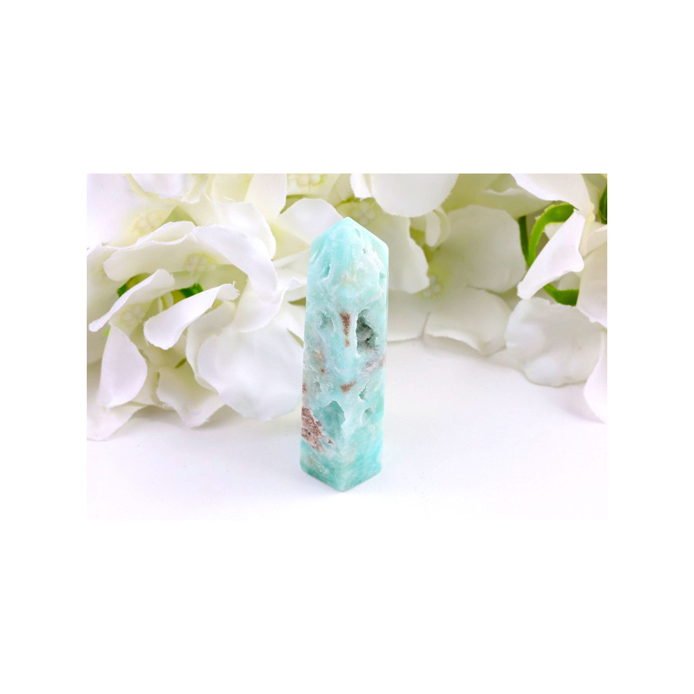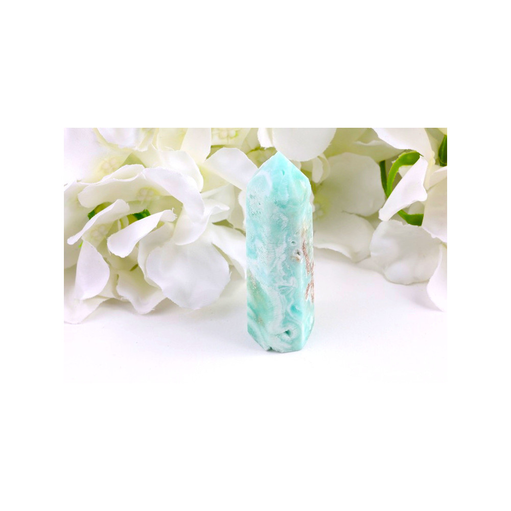 Tento okouzlující hemimorfit obelisk zaujme svou nádhernou tyrkysově modrou barvou s jemnými zelenými odstíny, která evokuje čistotu přírodních vod a nebeskou harmonii. Kámen má elegantní protáhlý tvar s klasickou hexagonální špicí, která symbolizuje propojení se spirituální energií. Povrch byl pečlivě vyleštěn do vysokého lesku, díky čemuž kámen krásně odráží světlo a vyniká jeho přírodní krása. Kompaktní rozměry 81×24×21 mm z něj činí ideální kus pro dekoraci i duchovní praxi. Jemné přírodní inkluze a struktury uvnitř kamene dokazují jeho autenticitu a jedinečnost.