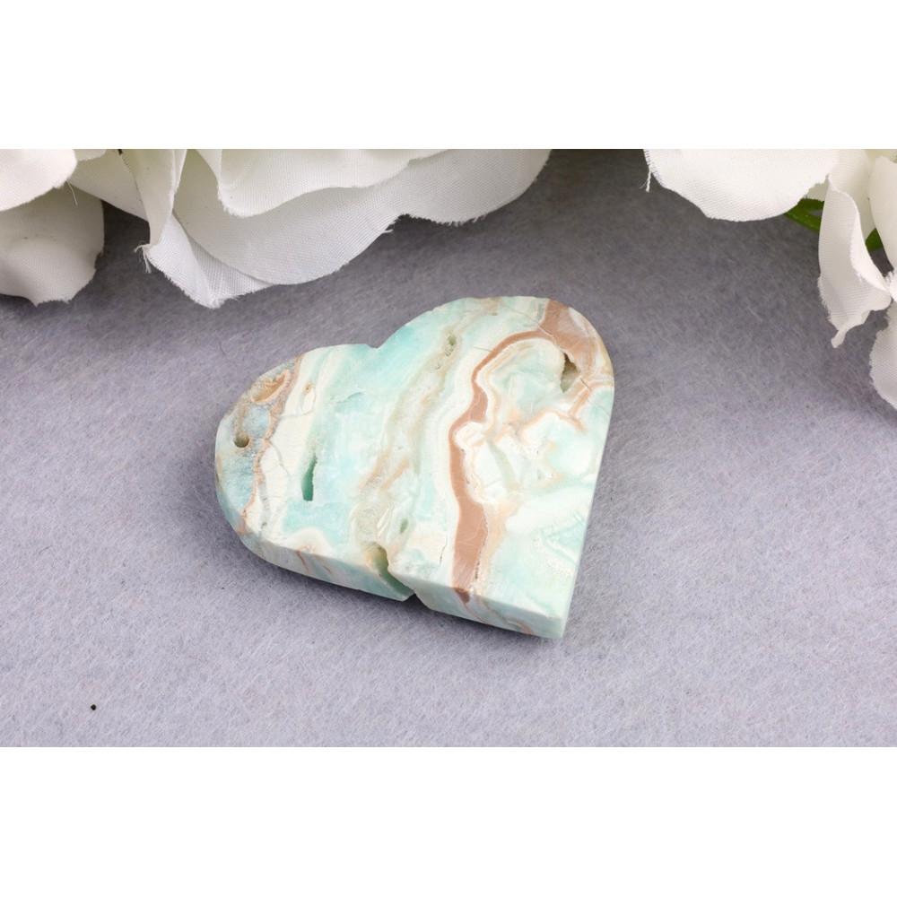 Toto konkrétní srdce z hemimorfitu č. 1170 uchvátí svými něžnými, převážně světle modrozelenými a bílými vrstvami, které se proplétají v organických tvarech. Kresba je jemná, s občasnými průsvitnými a světlejšími partiemi. Minerál je protkán drobnými hnědými až oranžovými žilkami, které dodávají kameni rustikální kouzlo a zvýrazňují jeho přírodní původ. Povrch je převážně hladký a příjemný na dotek, s matným až hedvábným leskem. Na některých místech jsou patrné přirozené drobné dutinky a nerovnosti, které jen podtrhují autenticitu a jedinečnost tohoto ručně vybraného kusu.