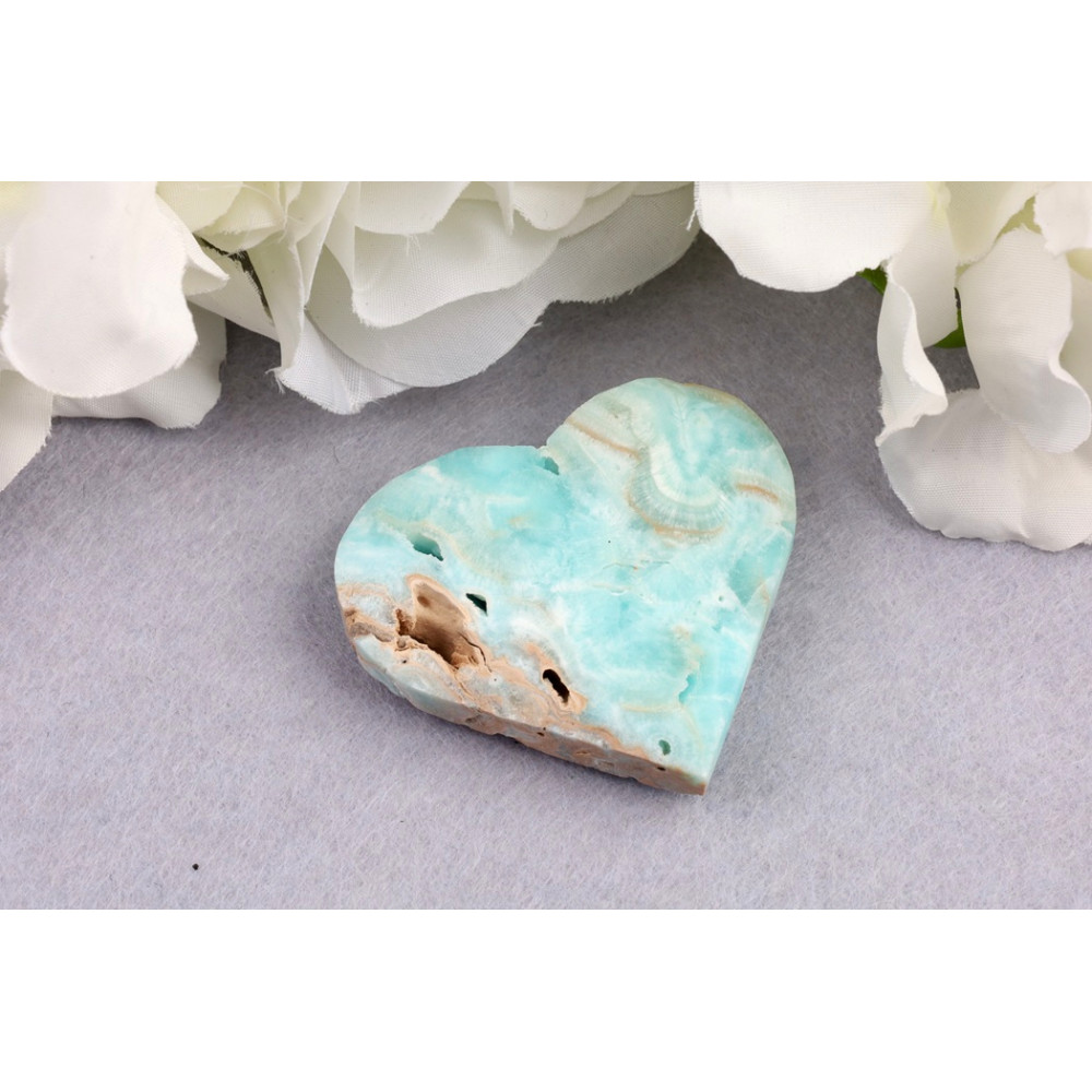 Toto konkrétní srdce z hemimorfitu číslo 1176 okouzluje svou jedinečnou kombinací barev a textur. Převažuje na něm nádherná tyrkysově modrá barva, která místy přechází do jemných světlých odstínů a vytváří vlnivé či oblačné vzory. Na pravé straně se minerál snoubí s přírodní, zemitě hnědou až béžovou matricí, která dodává kameni organický a autentický vzhled. Zde jsou také patrné drobné přírodní dutinky a nepravidelnosti, které podtrhují jeho původ a činí z něj skutečný originální kus. Leštěné plochy se jemně lesknou, zatímco v neopracovaných částech můžete obdivovat surovou krásu přírodního minerálu.