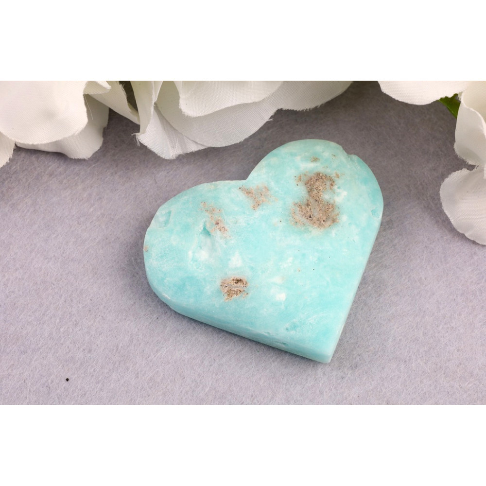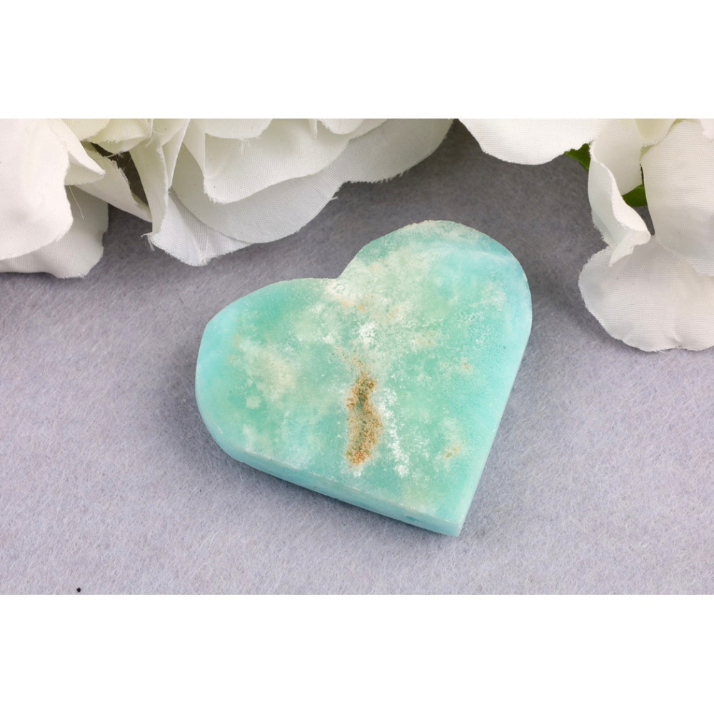 Tento konkrétní kus srdce z hemimorfitu č. 1178 okouzluje svou jemnou, světle modrozelenou barvou, která připomíná klidnou tyrkysovou lagunu. Povrch kamene je hladce leštěný, ale s viditelnými přírodními inkluzemi a hnědavými matnými skvrnkami, které dodávají kameni autentický, zemitý charakter. Tyto detaily vytvářejí jedinečnou kresbu, která zvýrazňuje jeho přírodní původ a krásu. Místy prosvítají bělavé vrstvy, které přidávají na hloubce a textuře, činí tak z tohoto srdce skutečně originální kus.