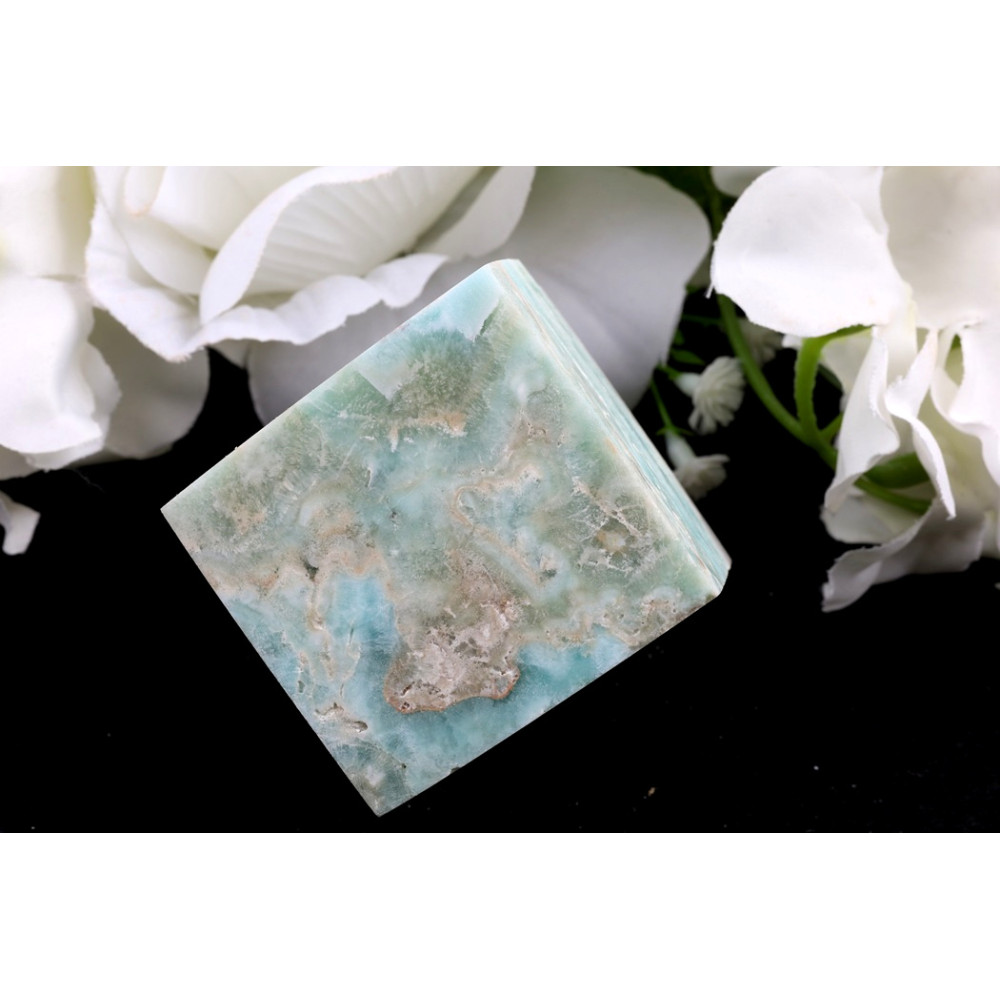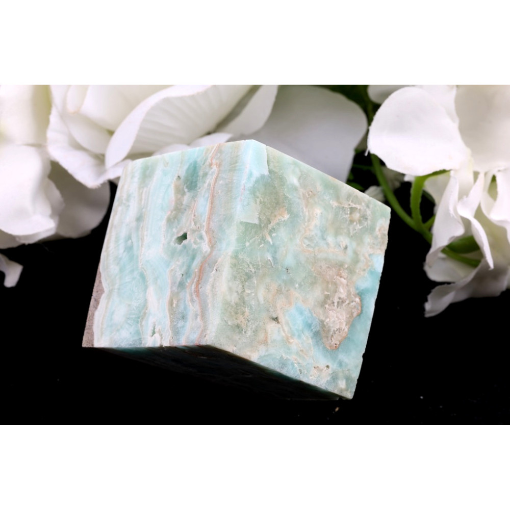 Tento fascinující kus hemimorfitu je vytesán do podoby robustní kostky, jejíž stěny odhalují vrstvy a kresby plné přírodní krásy. Převládá na něm něžná, pastelová modrozelená barva, která se plynule mísí s teplejšími tóny béžové a světle hnědé, vytvářející nádherný mramorovaný efekt. Na některých místech lze pozorovat jemné rýhy a přirozené inkluze, které dodávají kameni autentický, nedotčený charakter. Jedná se o skutečně originální kus, který si zachovává svou surovou esenci.