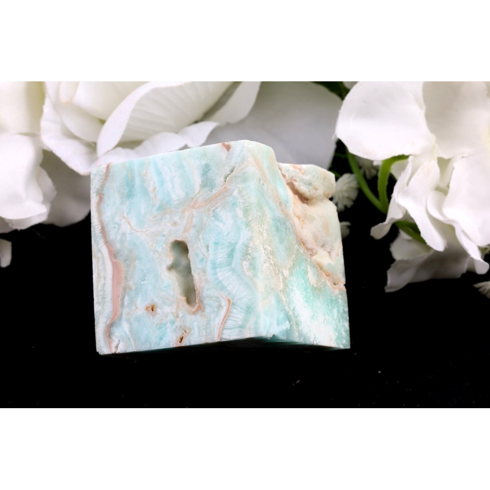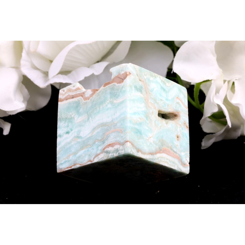 Tato originální kostka z Hemimorfitu č.1414 uchvátí svou jemnou světle modrou barvou, která se prolíná s krémovými až hnědavými pásy a vlnkami, vytvářejícími na jejím povrchu fascinující přírodní kresbu. Na některých stranách jsou patrné drobné, přirozeně vzniklé dutinky a hrubší, rýhované textury, které dodávají kameni autentický, surový charakter. Hrany jsou částečně opracované, avšak zachovávají pocit z přírodního, nefalšovaného kusu.