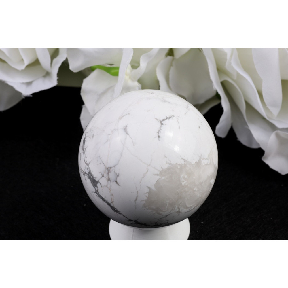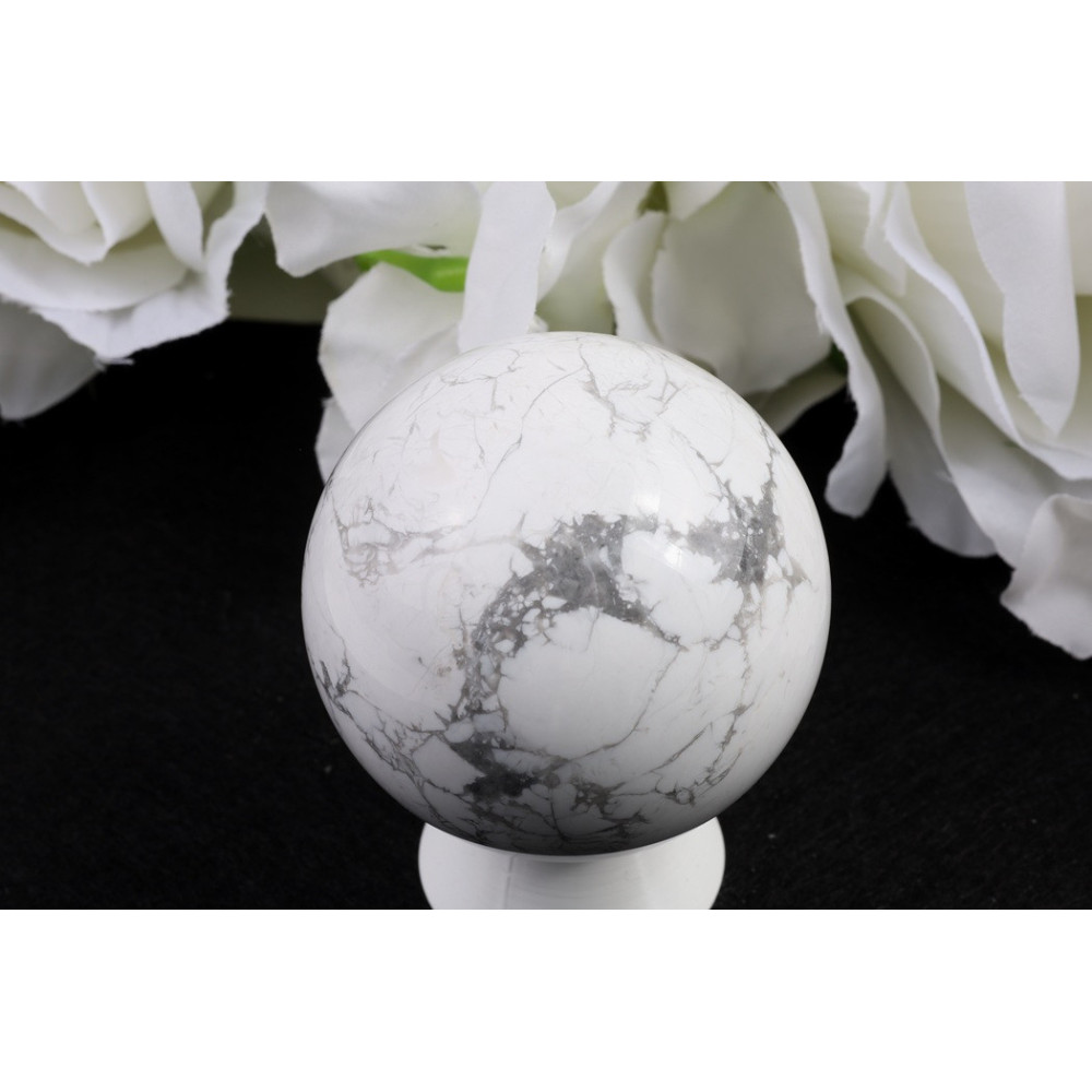 Tato nádherná howlitová koule uchvátí svým jemným vzhledem. Bílý až světle fialový podklad je protkán elegantními šedými žilkami, které vytvářejí přirozenou mramorovou kresbu. Vysoký leštěný povrch zajišťuje dokonalý odlesk a hladký povrch příjemný na dotek. Koule má pravidelný tvar s průměrem 54 mm a díky své kompaktní velikosti je ideální pro meditaci i dekoraci.