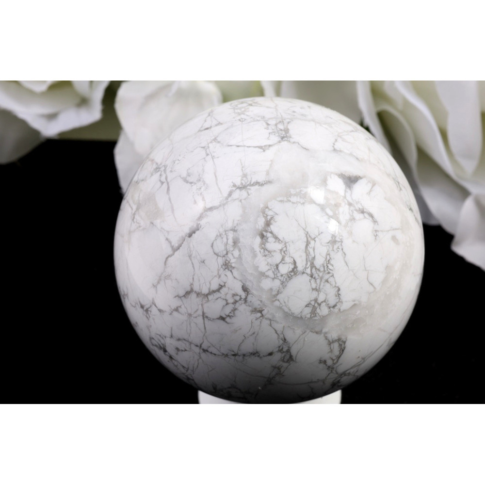 Objevte kouzlo této unikátní howlitové koule a přeneste si domů kus přírodní elegance. Každá koule je originál s neopakovatelnou kresbou, která činí tento kus skutečně výjimečným. Nechte se okouzlit jemnou energií bílého howlitu a využijte jeho uklidňující působení ve svém každodenním životě.