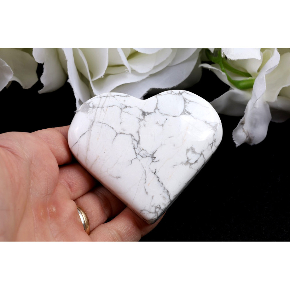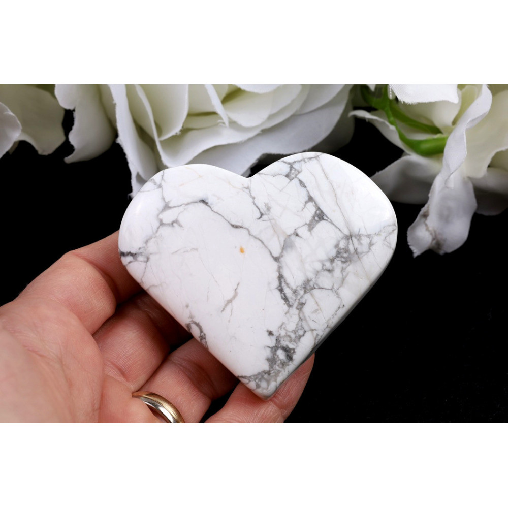 Tento konkrétní kus představuje elegantní howlitové srdce vybroušené do pravidelného symetrického tvaru. Povrch zdobí nepravidelně probíhající šedé až tmavší žilky, které vytvářejí přírodní mramorovaný vzor typický pro howlit. Kámen má jemný hedvábný lesk a mléčně bílou základní barvu, která je krásně protkána kontrastními šedými liniemi. Každý kus je díky přirozenému vzoru žilkování naprosto jedinečný.