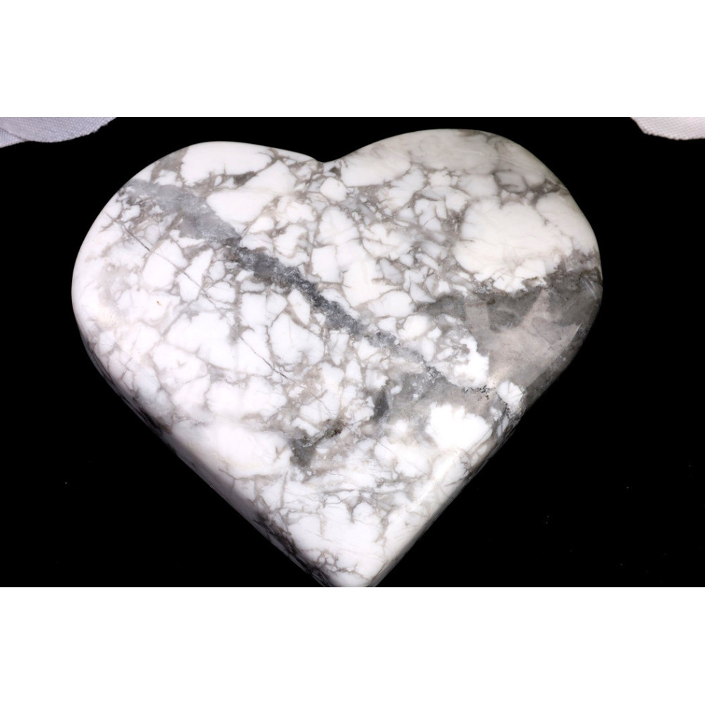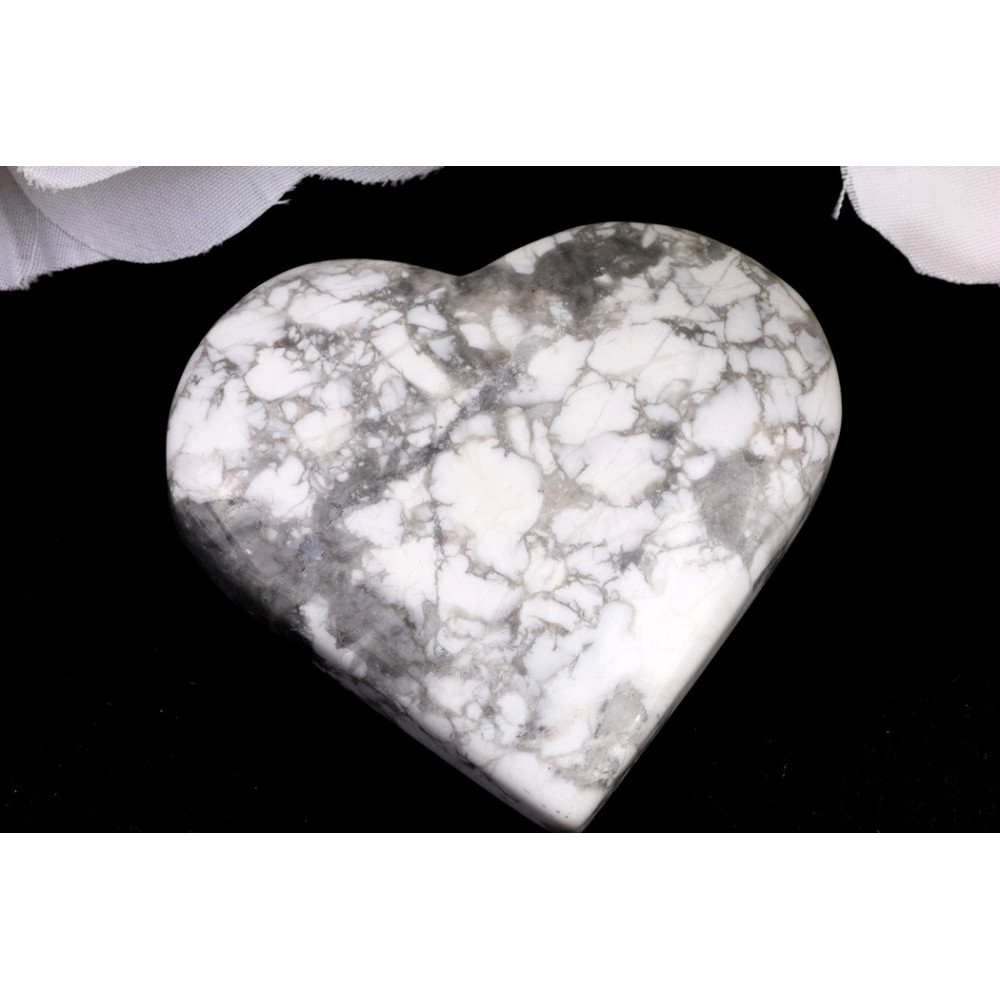 Před vámi leží srdce z bílého howlitu, které okouzlí svou jemnou krásou. Je dokonale vyleštěné do hladkého, lesklého povrchu, jenž vybízí k pohlazení. Minerál je převážně bílý s charakteristickou, složitou šedou až téměř černou žilnatinou, která připomíná pavučinu nebo mramor. Tyto přirozené kresby dodávají každému kusu jedinečný a nezaměnitelný charakter. Tvar srdce podtrhuje jeho estetickou i symbolickou hodnotu, přinášející pocit lásky a pohody.