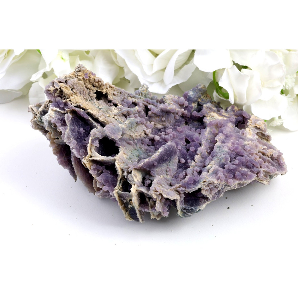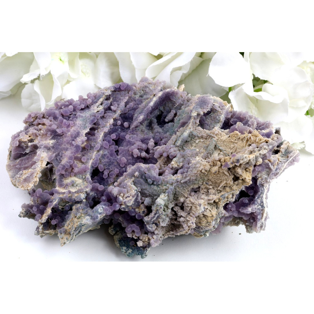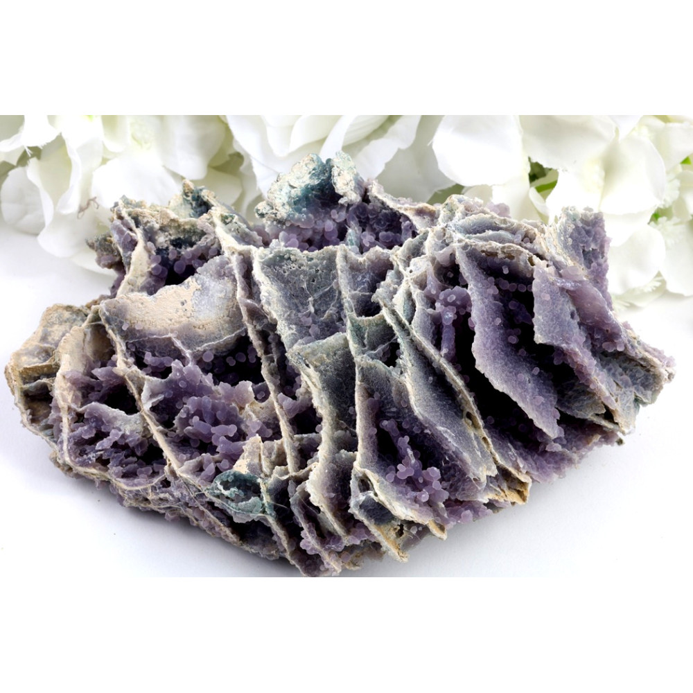 Tento konkrétní exemplář hroznového achátu, označovaný jako č.1599, se pyšní bohatou a komplexní botryoidní strukturou, která připomíná klastr miniaturních fialových hroznů, vystupujících z šedavě-béžové matrix. Jeho povrch je tvořen nesčetnými drobnými kuličkami, jejichž odstíny se pohybují od syté, snové fialové až po jemné levandulové tóny, přičemž některé části vykazují i nazelenalé či modravé inkluze, dodávající celku ještě větší hloubku a dynamiku. Okraje kamene a některé spodní partie odhalují surovější, pískovcovou texturu, která kontrastuje s hladšími, jemně lesklými povrchy "hroznů".
