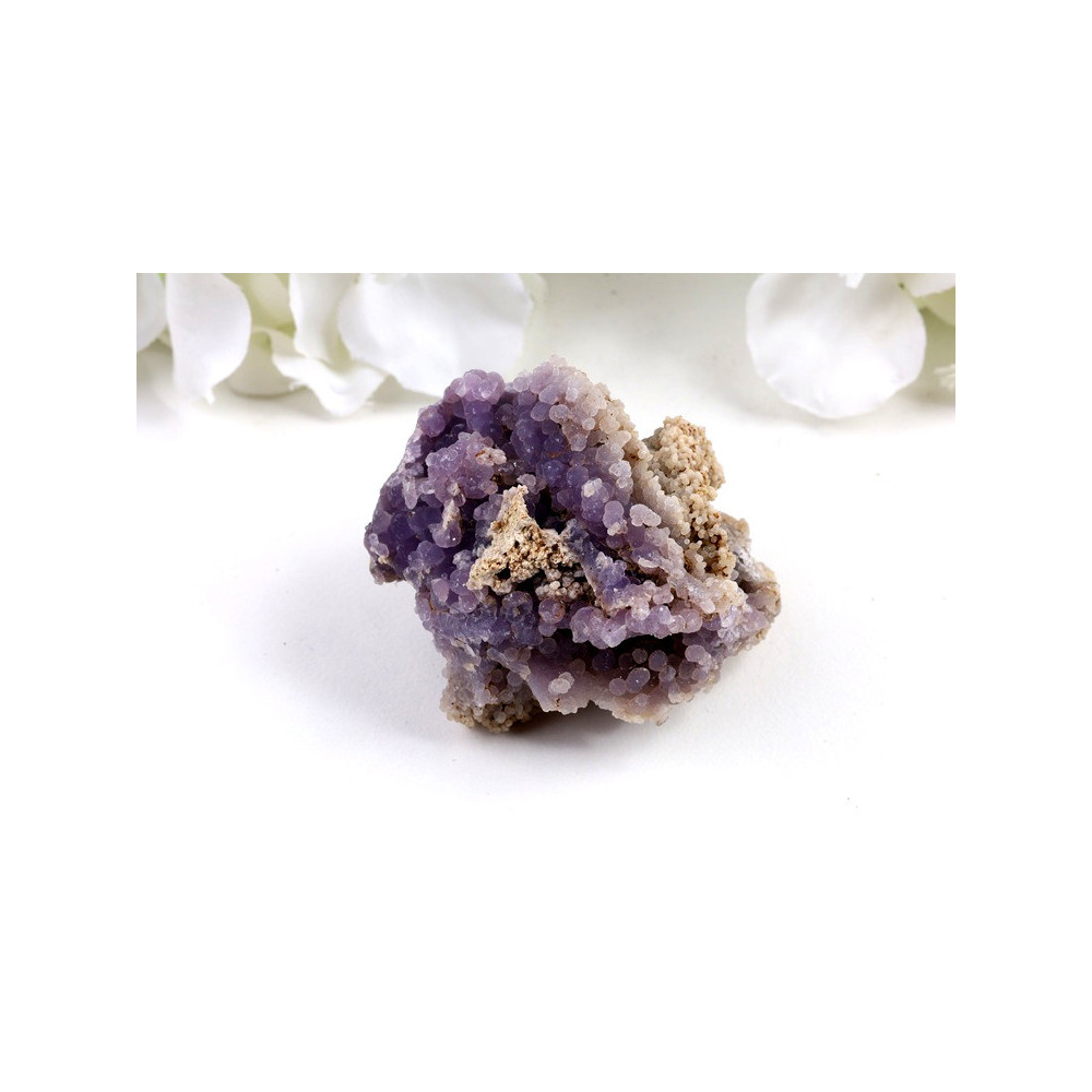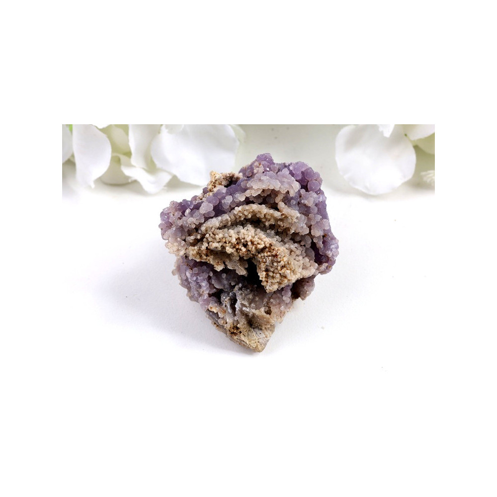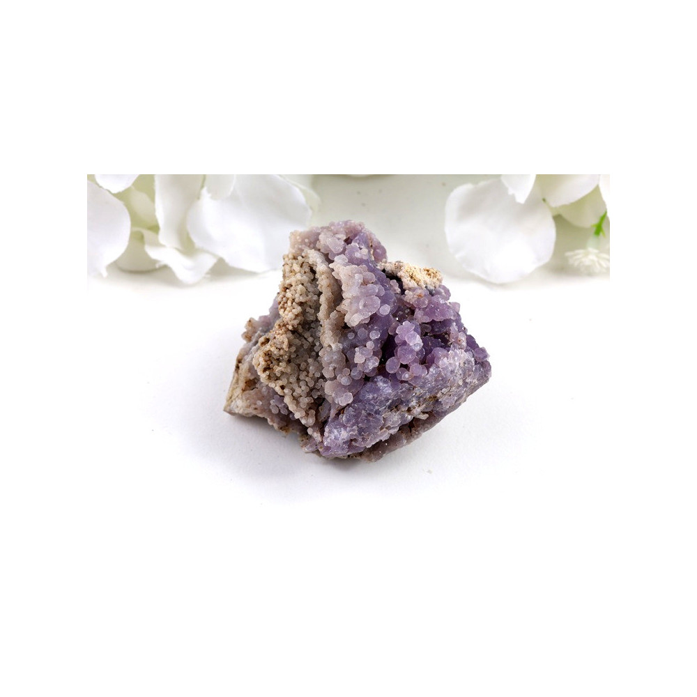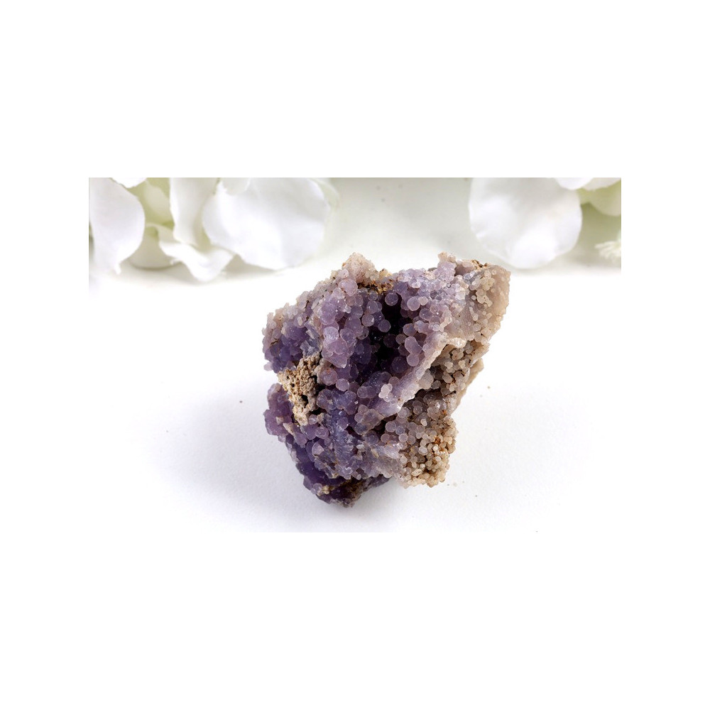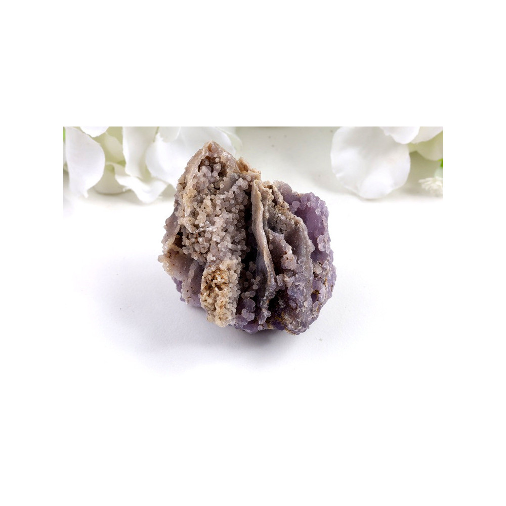 Tento krásný hroznový achát okouzlí na první pohled svými jemnými krystalickými útvary připomínajícími révu vinných hroznů. Povrch kamene je pokryt drobnými kulovitými krystaly v noblesních fialových a šedofialových tónech, které vytvářejí půvabný kontrast s přirozenou hnědou základnou. Každý drobný krystal odráží světlo a vytváří tak zajímavou hru barev a odlesků. Přírodní tvar kamene je kompaktní a dobře se vejde do dlaně, což umožňuje hluboké propojení s jeho energií při meditaci. Povrch je příjemně hrubý na dotek díky struktuře krystalů, která je typická pro tento vzácný minerál.