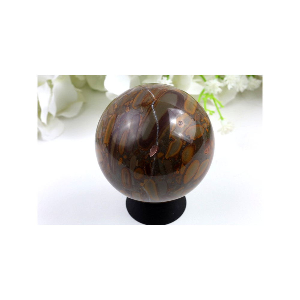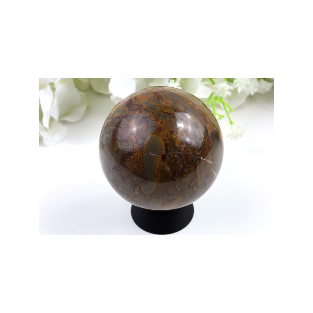 Tento unikátní kus bambus jaspisu se prezentuje ve formě dokonale vyleštěné koule o průměru 61 mm. Povrch kamene zdobí fascinující kombinace tmavě hnědých a čokoládově hnědých odstínů, které jsou prostoupeny charakteristickými olivově zelenými pásy a skvrnami. Leštění na vysoký lesk vytváří nádherné světelné odlesky, které zvýrazňují přírodní kresbu připomínající bambus. Na povrchu koule se střídají světlejší a tmavší pruhy, místami doplněné zelenkavým mramorováním, což vytváří jedinečný a nepravidelný vzor typický pro tento minerál. Každý pohled odhaluje nové detaily této přírodní kompozice.
