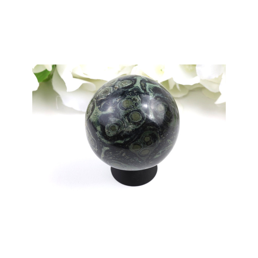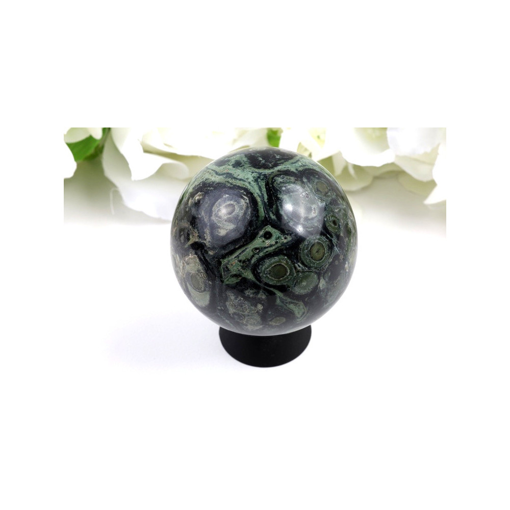 Tato nádherná koule Kambaba jaspisu okouzlí na první pohled svým charakteristickým zbarvením a organickým vzorováním. Její povrch zdobí fascinující směs tmavě zelených až téměř černých odstínů, které se prolínají s jemnými kruhovými a spirálovitými útvary připomínajícími fosilie či pradávné organismy. Tyto přirozeně vzniklé vzory vytvářejí hypnotizující mandalu, která přitahuje pohled a uklidňuje mysl.