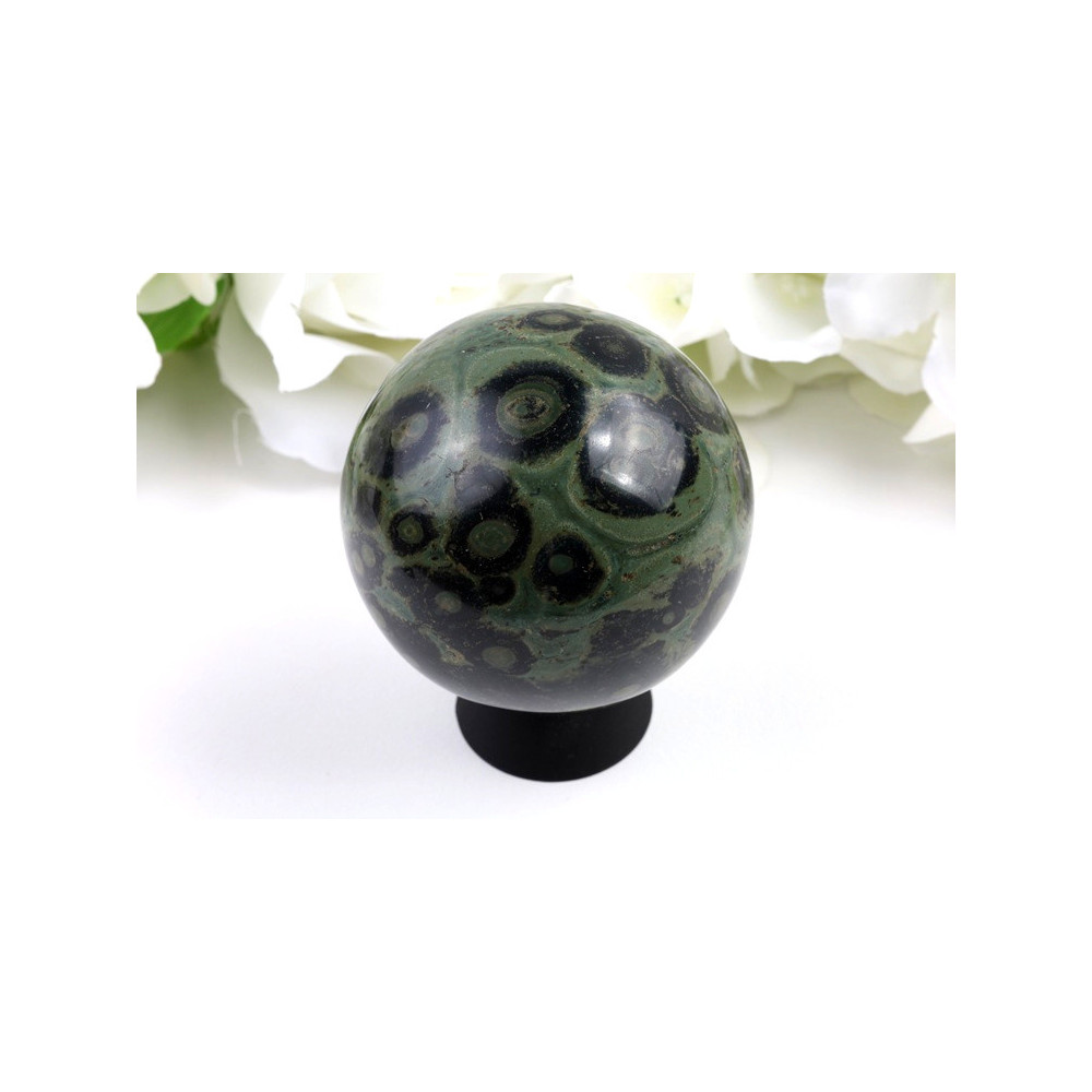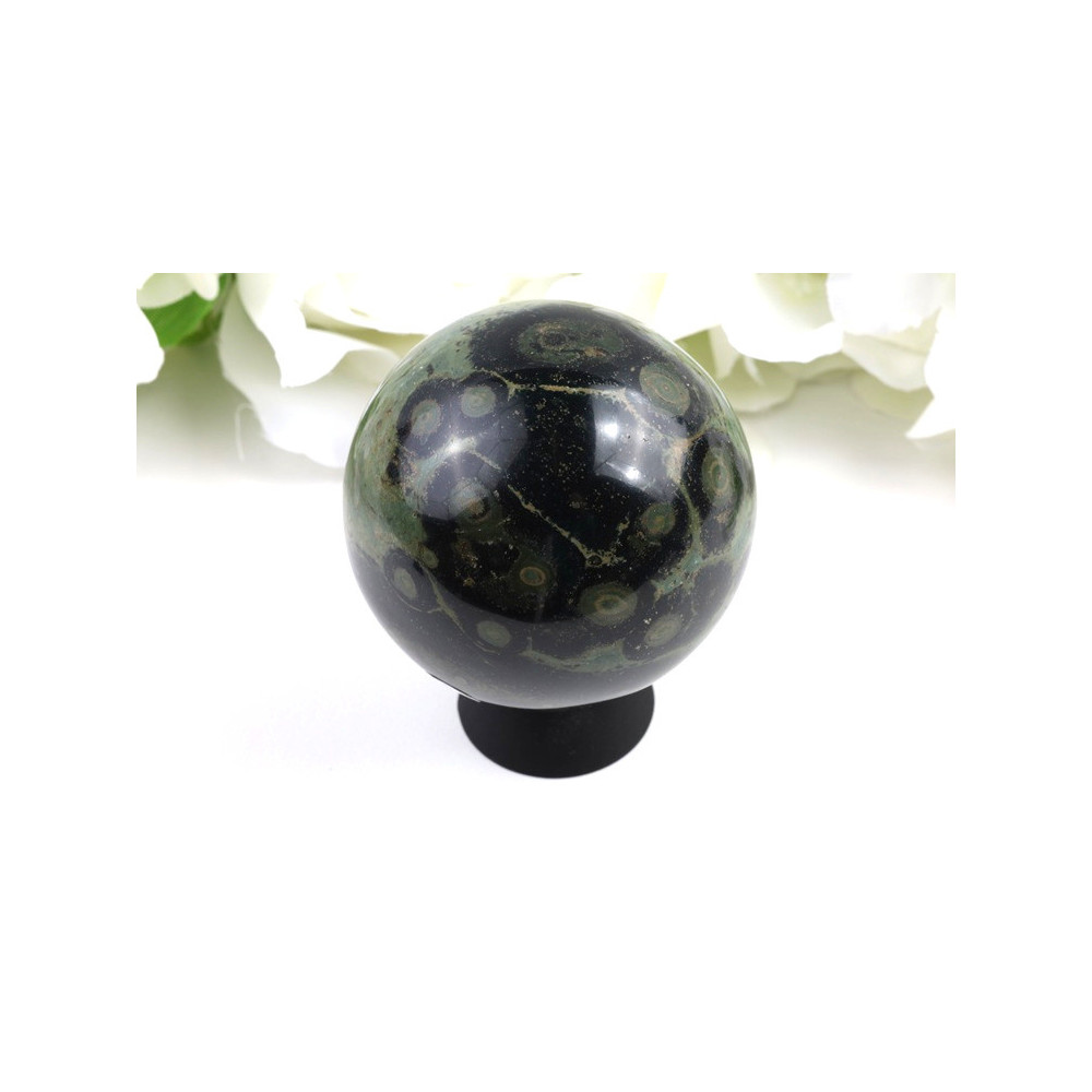 Před vámi se nachází nádherná leštěná koule z Kambaba jaspisu o průměru 65 mm. Tento jedinečný kámen se vyznačuje charakteristickým tmavě zeleným až černým podkladem, který je protkán hypnotickými kruhovými vzory připomínajícími pradávné fosilie nebo tajemné galaxie. Povrch koule je pečlivě vybroušen na vysoký lesk, který dokonale zvýrazňuje hluboké odstíny a přírodní kresby kamene. Každý detail tohoto přírodního úkazu je unikátní a neopakovatelný, což z této koule činí skutečný sběratelský klenot. Hmotnost 385 gramů dodává kouli příjemnou stabilitu a pocit solidarity při držení v ruce.
