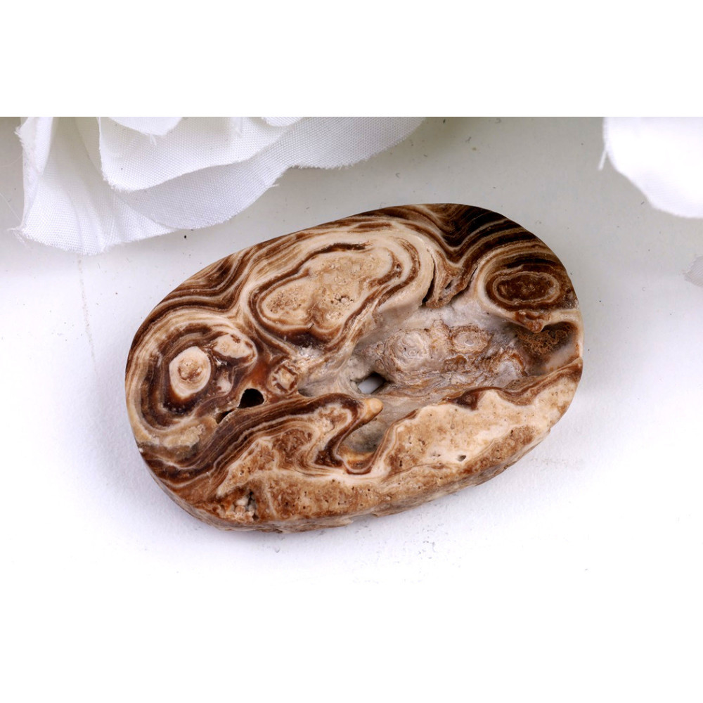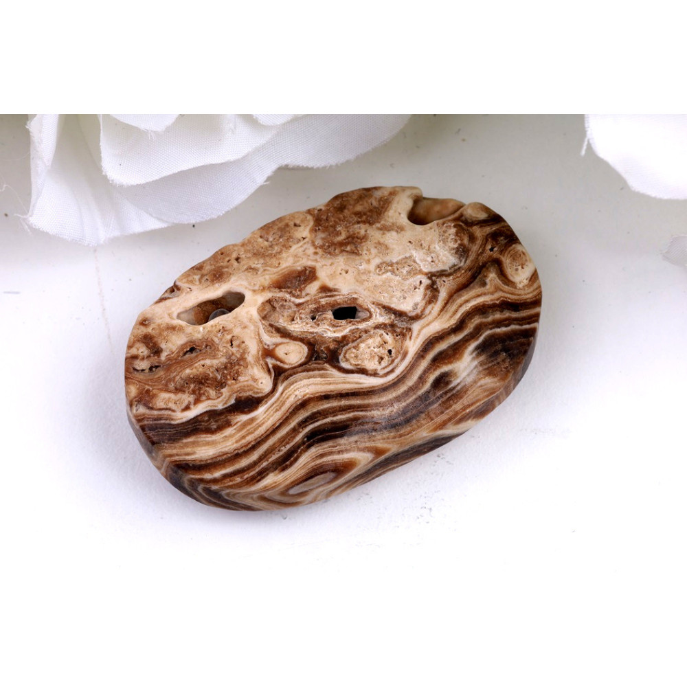 Tato unikátní hmatka z jantarového kalcitu č. 837 láká na pohled svou fascinující kresbou. Barvy se pohybují od smetanově bílé, přes medově žlutou až po sytě hnědou, vytvářející spirálovité a vrstvené vzory připomínající letokruhy dřeva nebo tekoucí med. Povrch je hladce leštěný, což zvýrazňuje jeho jemný lesk a teplé tóny. Uprostřed a po stranách jsou patrné přírodní dutinky a prohlubně, které dodávají kameni autentický, organický vzhled a pocit surovosti. Každá prohlubeň vypráví svůj příběh, a činí tak tento originální kus skutečně jedinečným.