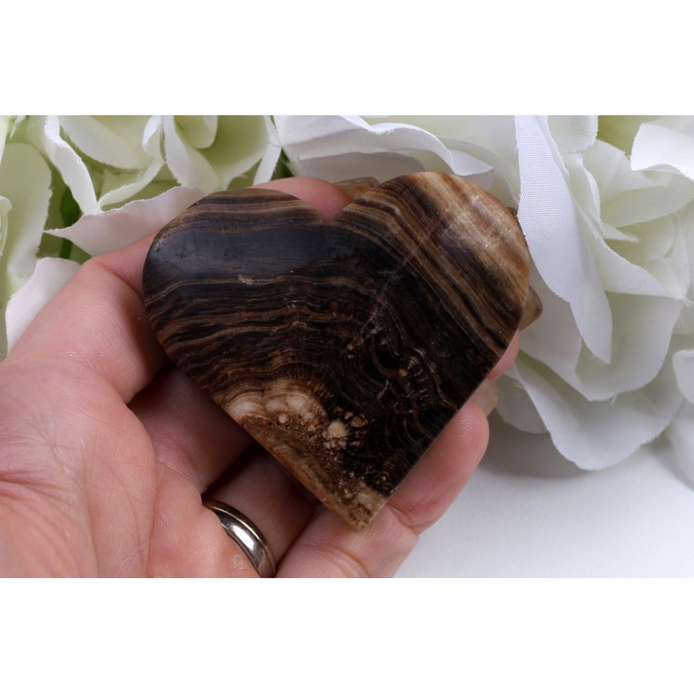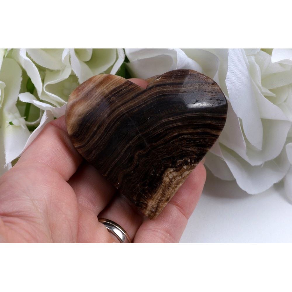 Tento jedinečný kus kalcitu v sobě ukrývá krásnou paletu teplých hnědých až jantarových odstínů, které připomínají sluneční paprsky prosvítající medem. Povrch srdce má hladký leštěný povrch s jemnými přirozenými strukturami. Tvar srdce je pečlivě vypracovaný s harmonickými proporcemi, díky čemuž kámen skvěle padne do dlaně. Celkový vzhled evokuje pocit tepla, útulnosti a pozitivní energie.