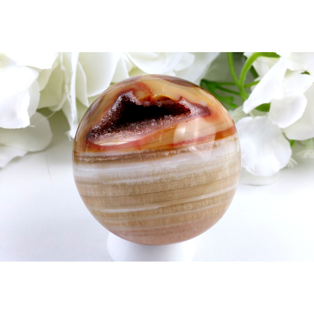Tato jedinečná koule z karneolu č. 1256 se pyšní bohatou paletou teplých odstínů, od sytě oranžových a cihlově červených pruhů po světlejší krémové a béžové pásy. Její povrch je dokonale hladký a lesklý, odrážející světlo. Z jedné strany ji zdobí fascinující drúzová dutinka, tvořená drobnými, třpytivými krystalky, která dodává kusu neopakovatelný charakter a hloubku. Na druhé straně se objevují tmavší, nepravidelné inkluze, které podtrhují přírodní původ a originalitu kamene. Spodní část koule je pak sytě hnědočervená s jemnou kresbou.