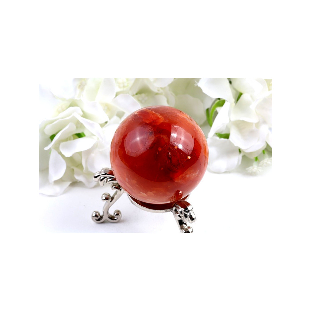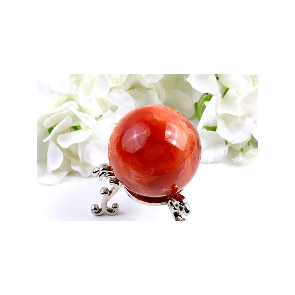 Tato karneolová koule zaujme na první pohled svou intenzivní tmavě oranžovo-červenou barvou s jemnými přechody a decentními pruhy, které podtrhují její přírodní původ. Povrch je vysoce leštěný do zrcadlového lesku, který perfektně odráží světlo a zvýrazňuje hloubku barvy minerálu. Koule má dokonale kulatý tvar s hladkým povrchem bez ostrých hran. Díky své hmotnosti 239 g má příjemnou váhu, která dodává pocit stability a kvality. Každá koule je unikátní svým barevným vzorováním a vnitřními strukturami, které vytvořila sama příroda.