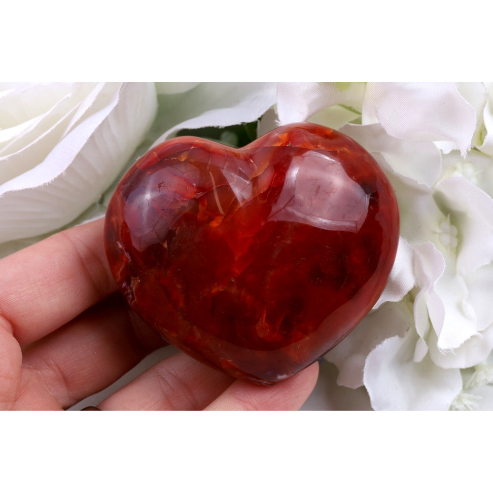 Tento ručně vybraný kus karneolu ve tvaru srdce uchvátí svou sytou oranžovo-červenou barvou, která na povrchu přechází do hlubokých, karamelových tónů. Průsvitné oblasti umožňují nahlédnout do fascinující vnitřní struktury, kde se proplétají různé odstíny a vytvářejí jedinečnou kresbu, připomínající plameny. Leštěný povrch krásně odráží světlo, zatímco jemné inkluze a přirozené linie dodávají tomuto minerálu autentický charakter.