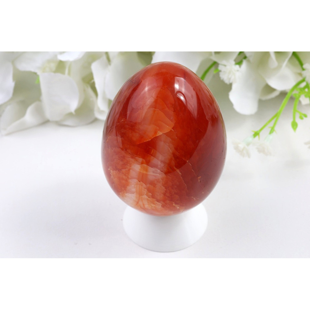 Toto karneolové vejce ze slavné brazilské lokality vás okouzlí svou sytě červeno-oranžovou až cihlově červenou barvou s nádechem mahagonu. Povrch je dokonale vyleštěný do vysokého zrcadlového lesku, který nádherně odráží světlo a vytváří výrazné odlesky na nejvyšších bodech vejce. Kámen je částečně průsvitný, zejména v tenčích partiích, což mu dodává hloubku a živý charakter. Struktura je homogenní, bez viditelných vrstev nebo inkluzí, což potvrzuje kvalitu tohoto přírodního drahokamu. Teplá červená barva evokuje energii slunce a přírody.