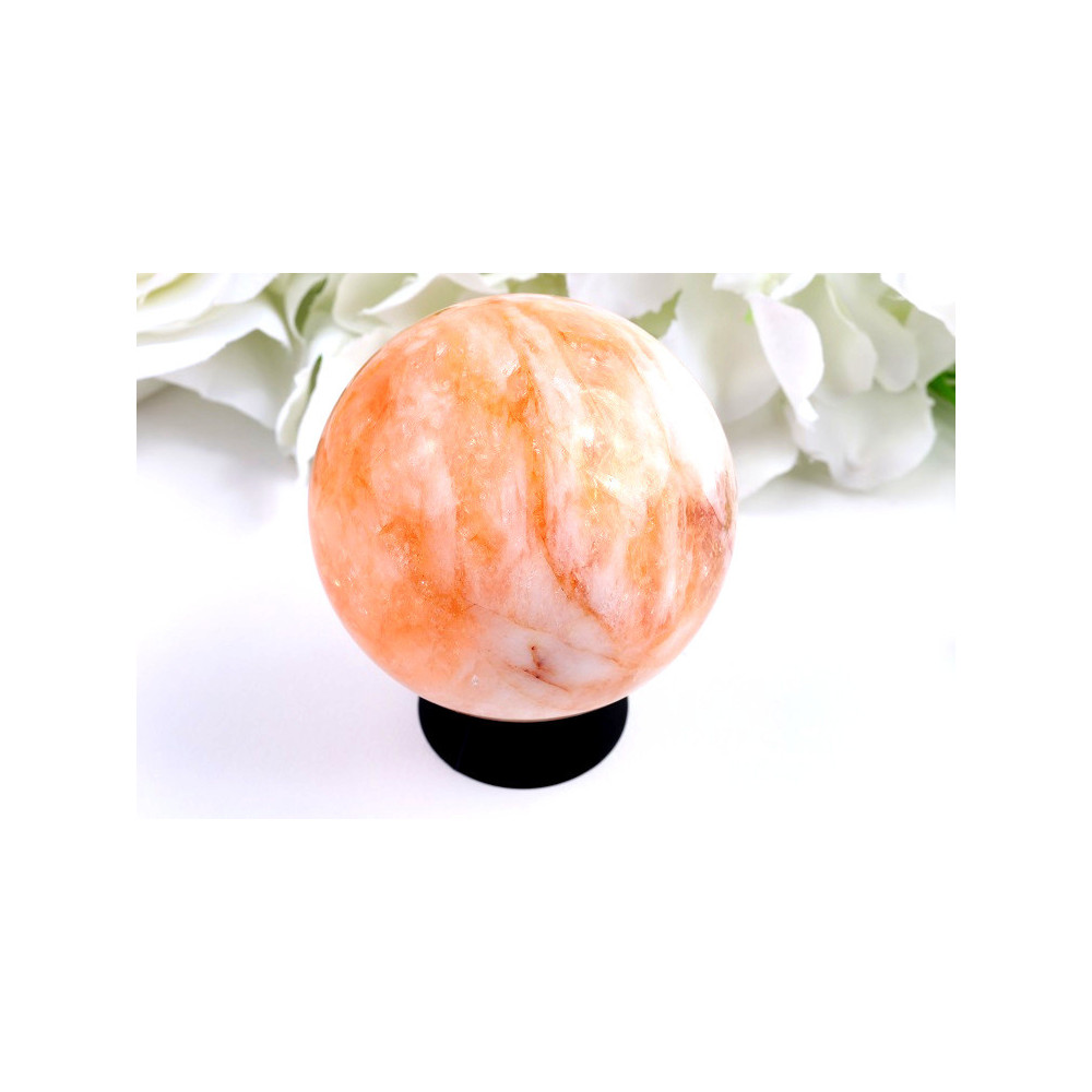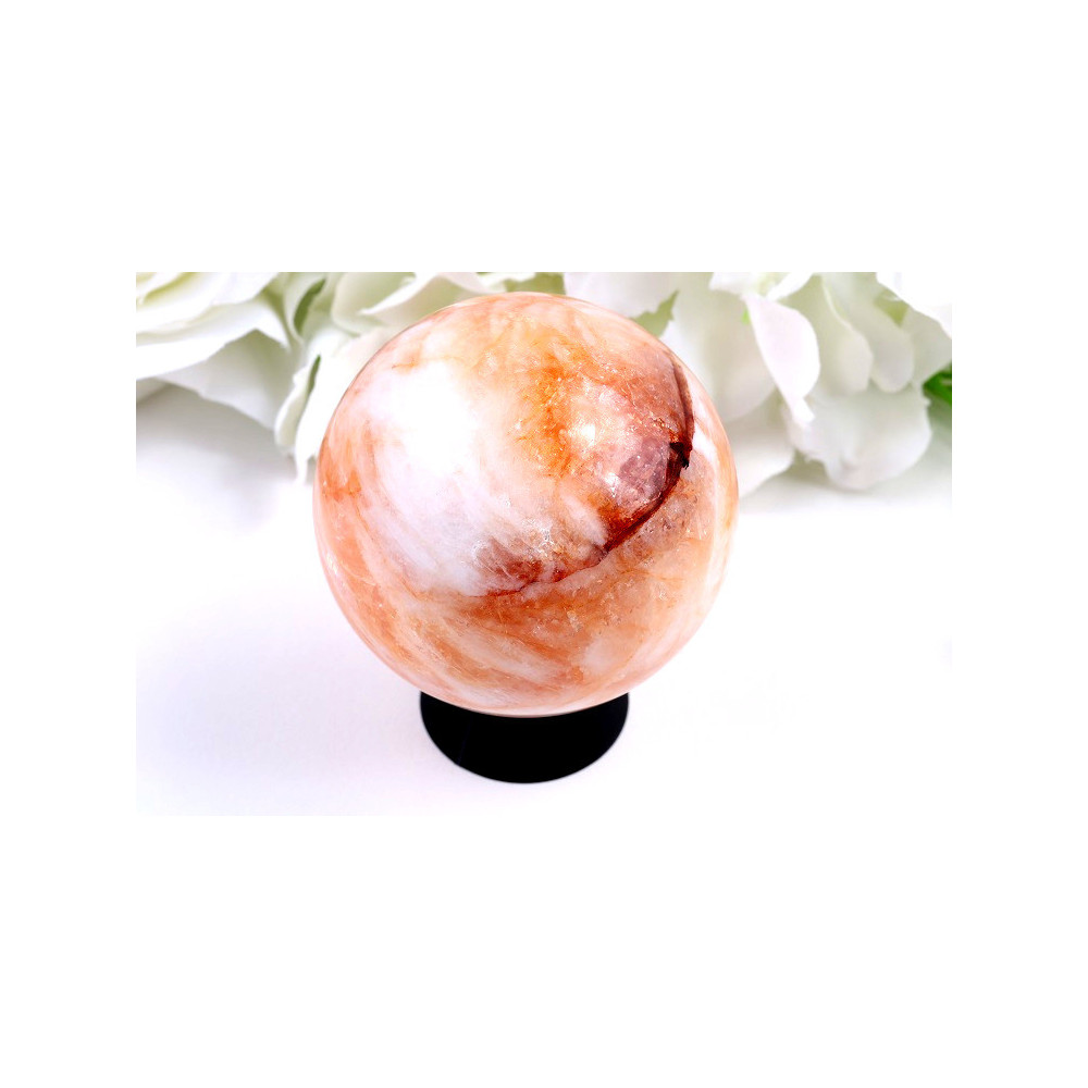 Při bližším pohledu můžete obdivovat jemné přechody barev – od průzračných partií křemene přes jemné mlžné oblasti až po výrazné ohnivé inkluze, které kameni dodávají jeho charakteristický a nezaměnitelný vzhled. Každá koule z ohnivého křemenu je naprosto jedinečná a neexistují dva stejné kusy. Hmotnost 336 g dodává kouli příjemnou stabilitu a působivost.