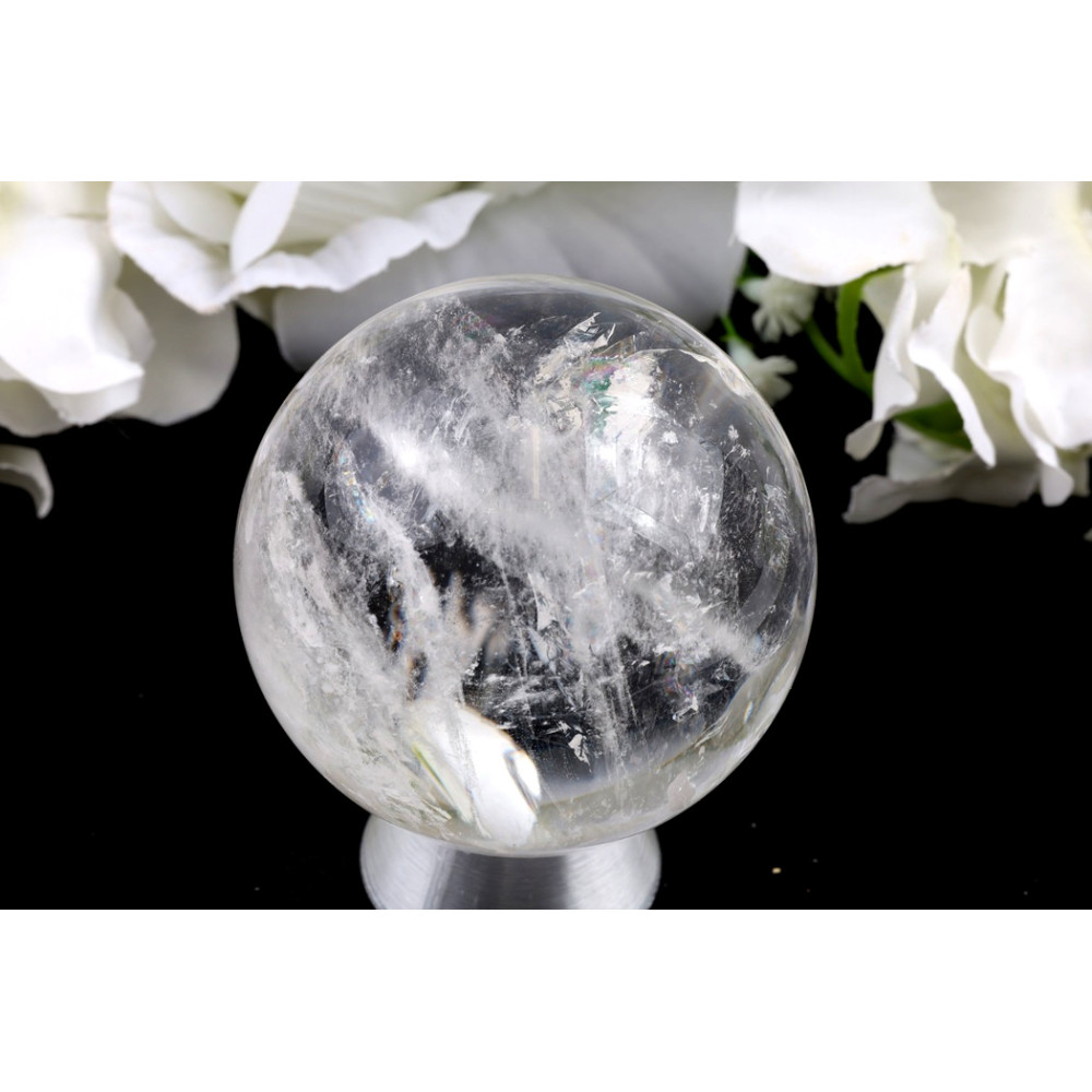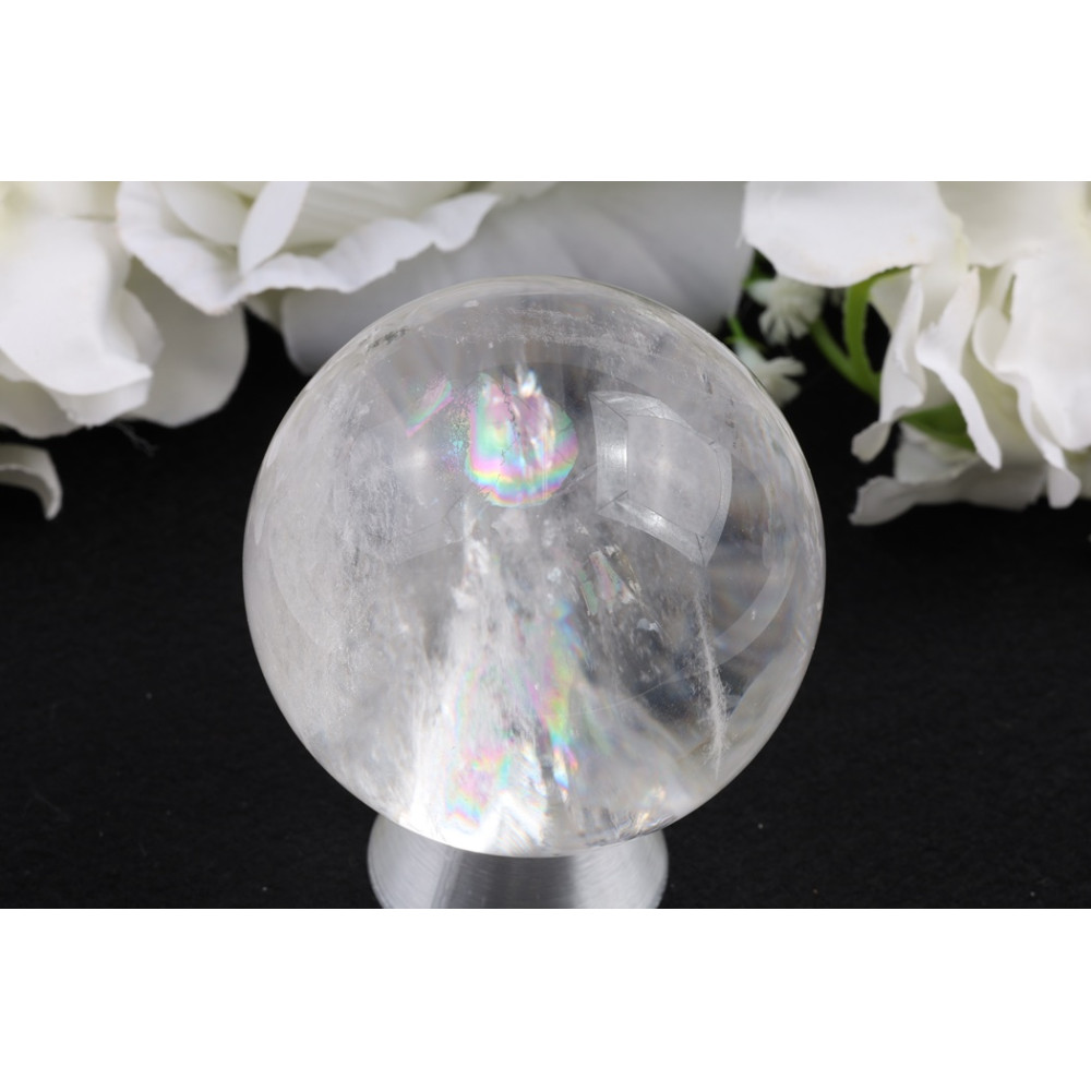 Tato konkrétní koule z křišťálu č. 1405 vyzařuje podmanivou průzračnost, charakterizovanou převážně čistým tělem. V jejích hlubinách vytvářejí jemné vnitřní lomy a závoje zajímavé vzory, které zachycují světlo a odhalují delikátní, éterické pramínky připomínající zmrzlou mlhu. Nejvýrazněji se jeden výrazný vnitřní lom nádherně láme do zářivého spektra duhových barev, které z různých úhlů dodávají úchvatnou hru irizujících odstínů. Povrch je dokonale leštěný, což umožňuje nerušený pohled do jejího jedinečného vnitřního světa.