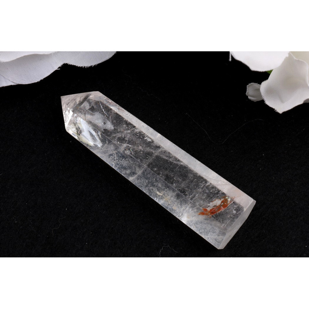 Tento konkrétní obelisk z křišťálu č. 971 zaujme svou převážně průzračnou, čirou krystalickou strukturou, která místy přechází do mléčně bílých závojů a inkluzí, dodávajících mu jedinečný charakter. Povrch je hladce leštěný, což umocňuje jeho lesk a umožňuje průhled do nitra kamene. U základny se v jedné části nachází výrazná, sytě oranžovo-červená inkluze, která tvoří zajímavý kontrast k jinak světlému kameni a dodává mu punc originality. Špice je precizně vybroušená a zachovává typický tvar obelisku, směřující k nebesům.