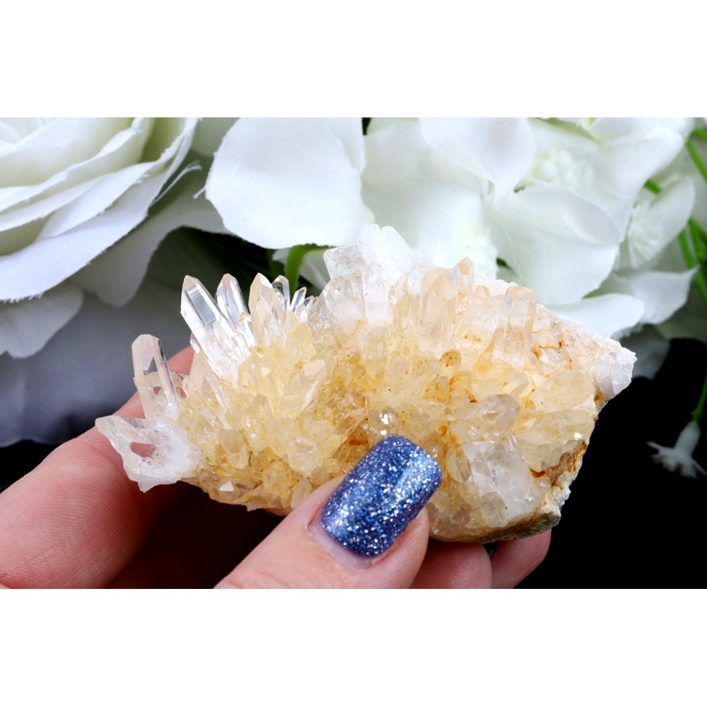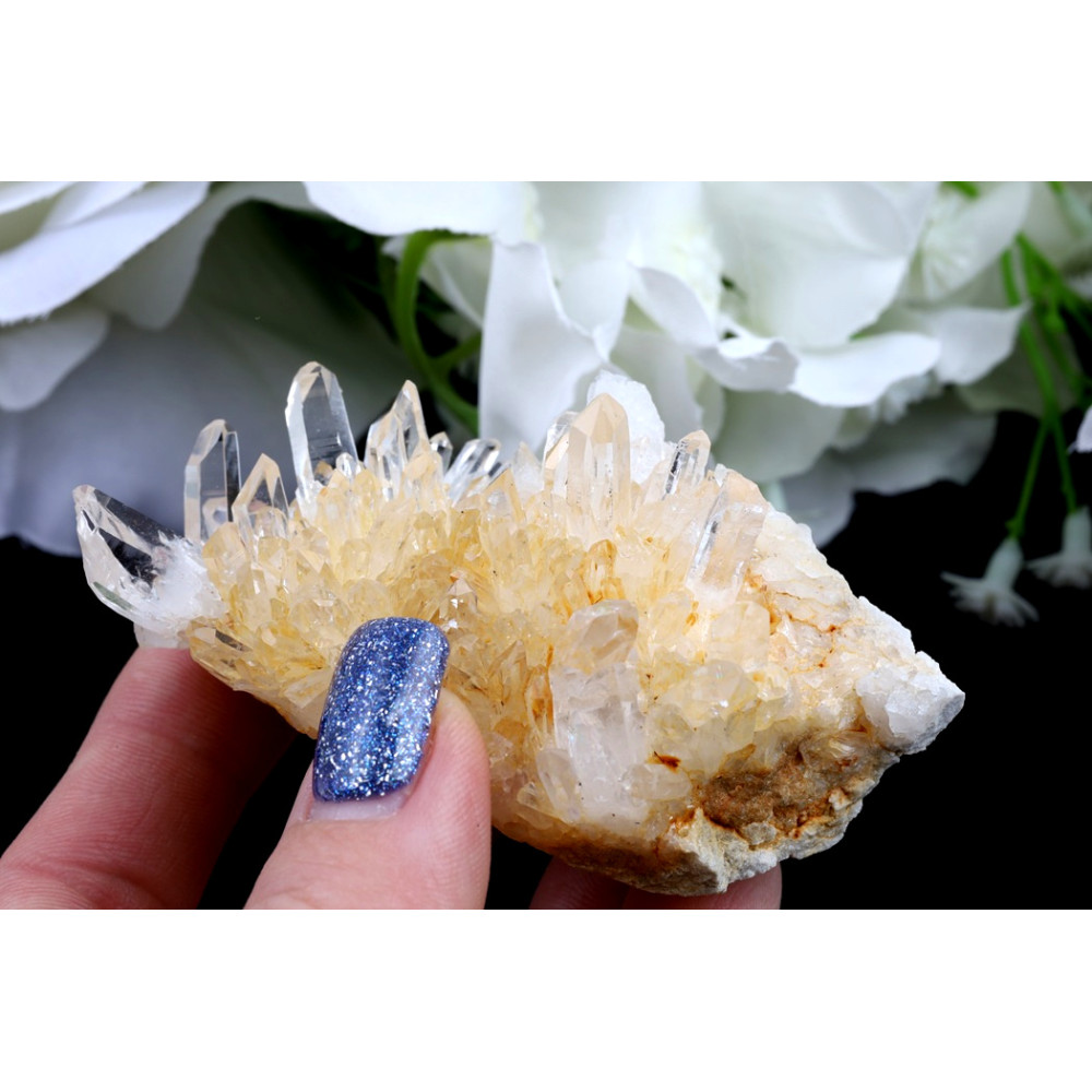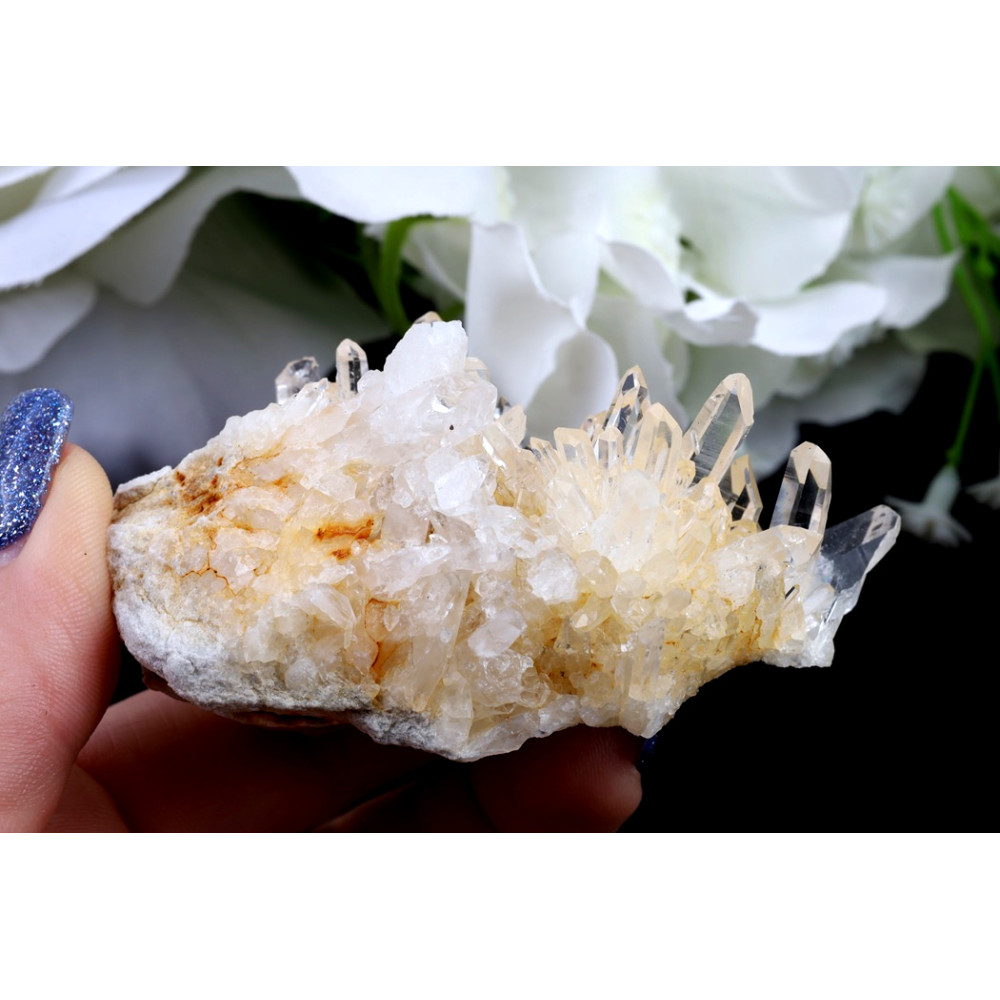 Tato okouzlující drúza křišťálu č. 1325 představuje fascinující shluk krystalů vyrůstajících z mateční horniny. Jednotlivé špičky krystalů jsou převážně průhledné až lehce mléčné, s jemnými žlutavými inkluzemi a zemitými tóny na bázi, které podtrhují jejich přírodní původ. Některé krystaly vykazují mimořádnou čistotu, zatímco jiné skrývají v sobě subtilní rýhování, které dodává celku hloubku a charakter. Z fotografie je patrný nádherný lesk ploch, které odrážejí světlo a vytvářejí tak oslnivou hru třpytu.