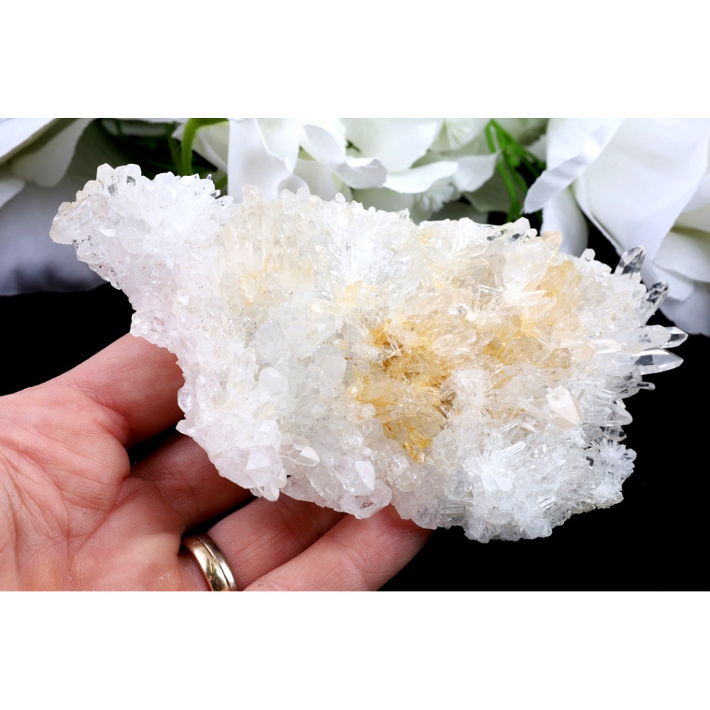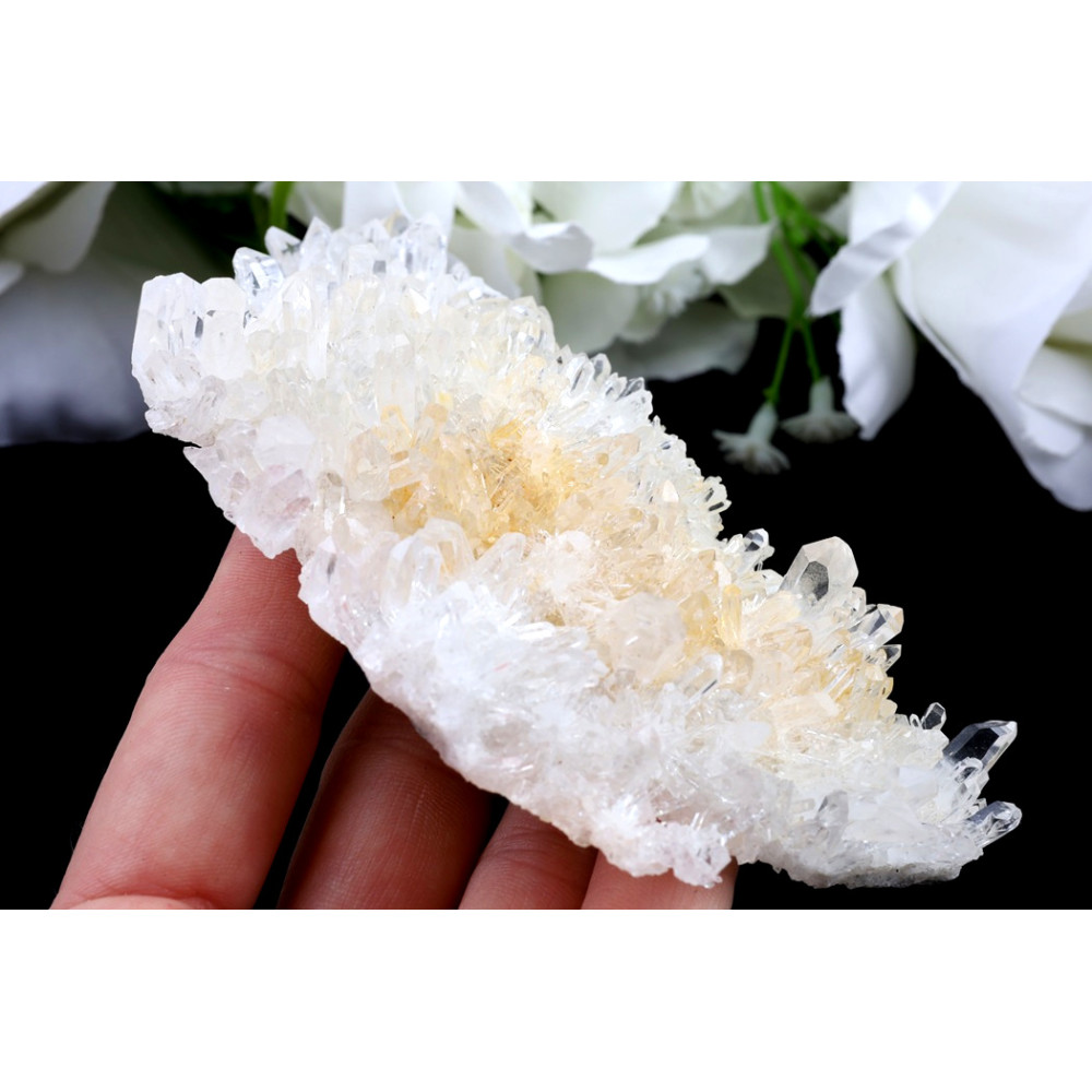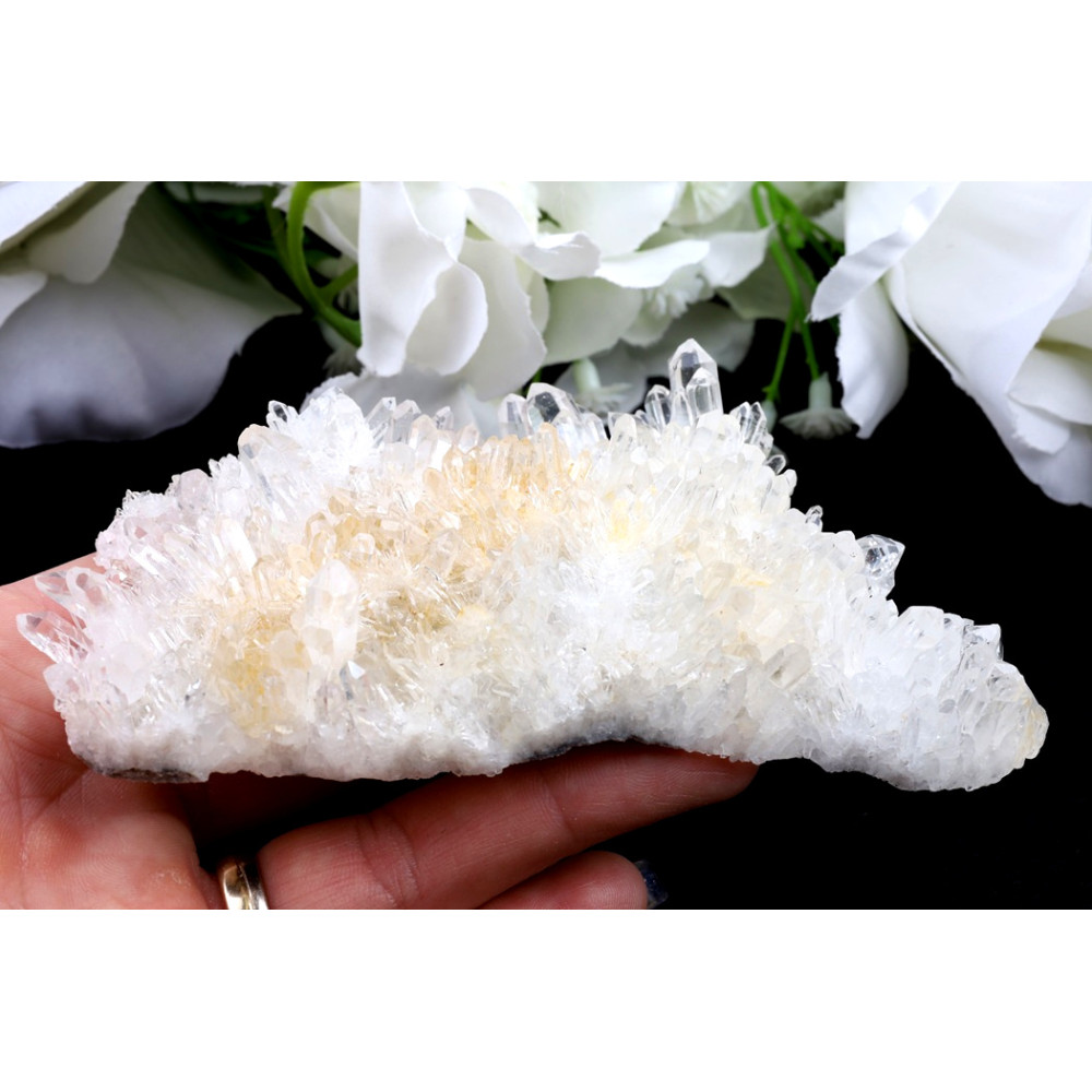 Tato křišťálová drúza ztělesňuje ryzí krásu přírodních krystalů, které se na ní vrství s něžnou grácií. Množství průzračných krystalových špiček, z nichž některé jsou zcela čiré a jiné nesou jemný, až medově nažloutlý nádech, vytváří fascinující texturu a hru světla. Menší krystaly se shlukují do bohatých seskupení, zatímco několik výraznějších špic vystupuje vzhůru, přitahujíc pohled a naznačujíc jejich individuální energii.
