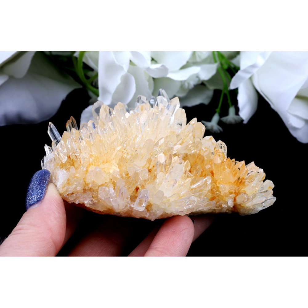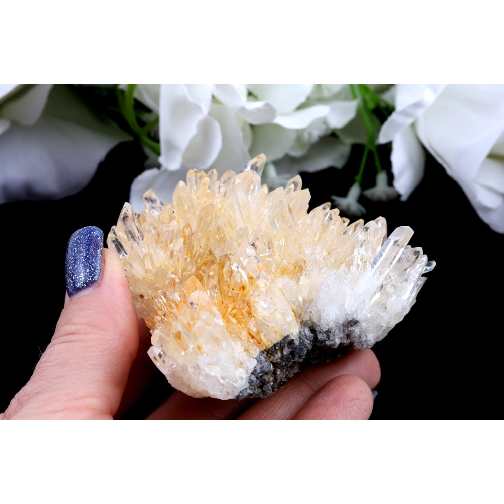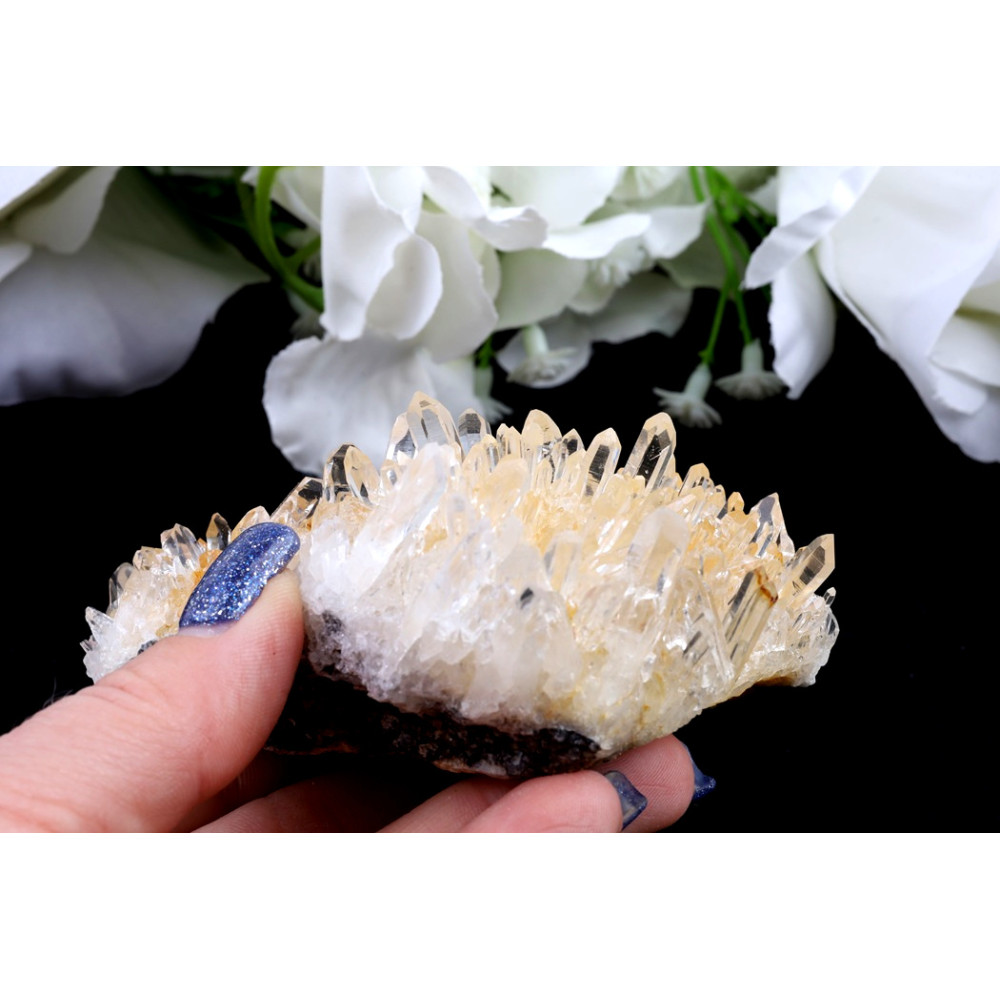 Tato křišťálová drúza č. 1335 okouzluje svou bohatou formací, tvořenou desítkami drobných, avšak dokonale tvarovaných křišťálových špiček. Většina krystalů se pyšní mléčně bílou až průzračnou barvou, která na světle nádherně jiskří a odráží jemné odlesky. Zvláštní půvab dodává tomuto kusu jemné žlutavé zabarvení, které na některých místech, zejména v hlubších partiích drúzy, přechází až do sytějšího zlatavého odstínu, naznačujícího přítomnost železitých minerálů a dodávajícího celku hřejivý tón. Povrch krystalů je převážně lesklý, s patrnými přírodními rýhami, které jsou typické pro růst křišťálu.